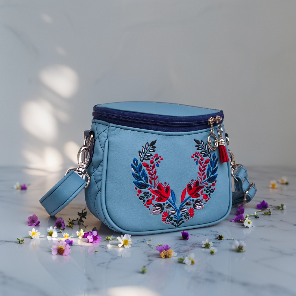 Menší baculatá kabelka je ušita z modro šedé koženky, ozdobená výšivkou.Vstup do kabelky se uzavírá zipem s tmavě modrou spirálou na dva jezdce (lze nosit na obou stranách těla).