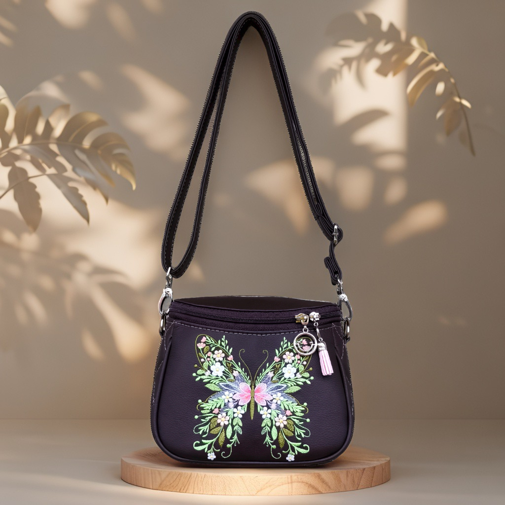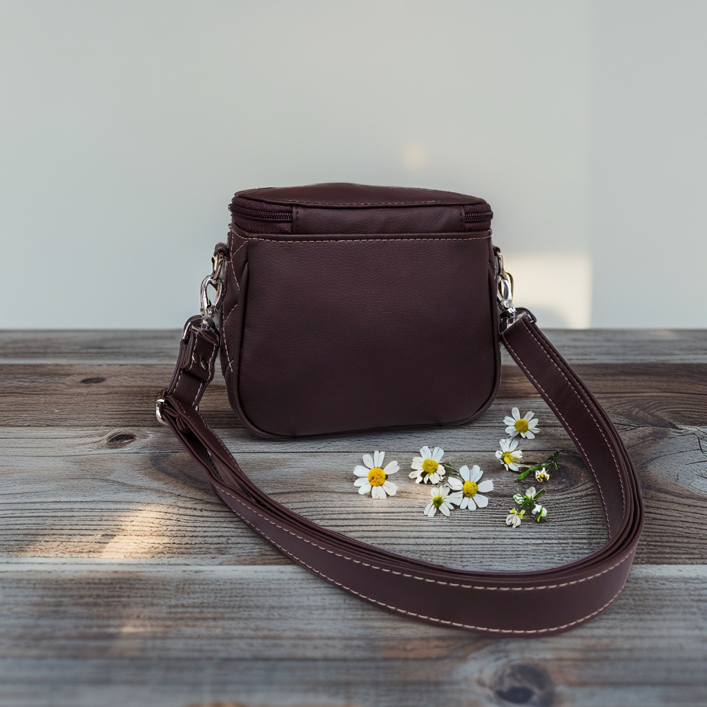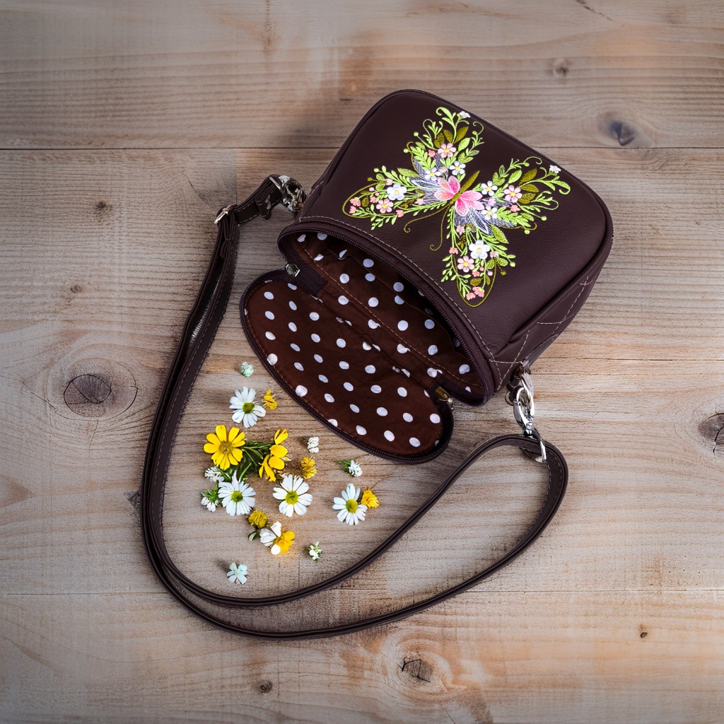 Menší baculatá kabelka je ušita z tmavě hnědé koženky, ozdobená výšivkou.Vstup do kabelky se uzavírá zipem s tmavě hnědou spirálou na dva jezdce (lze nosit na obou stranách těla).