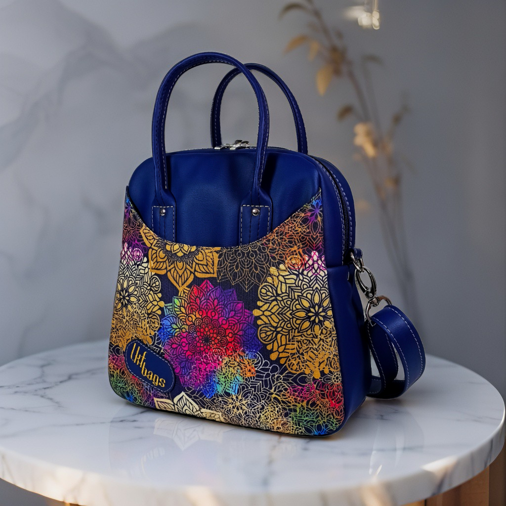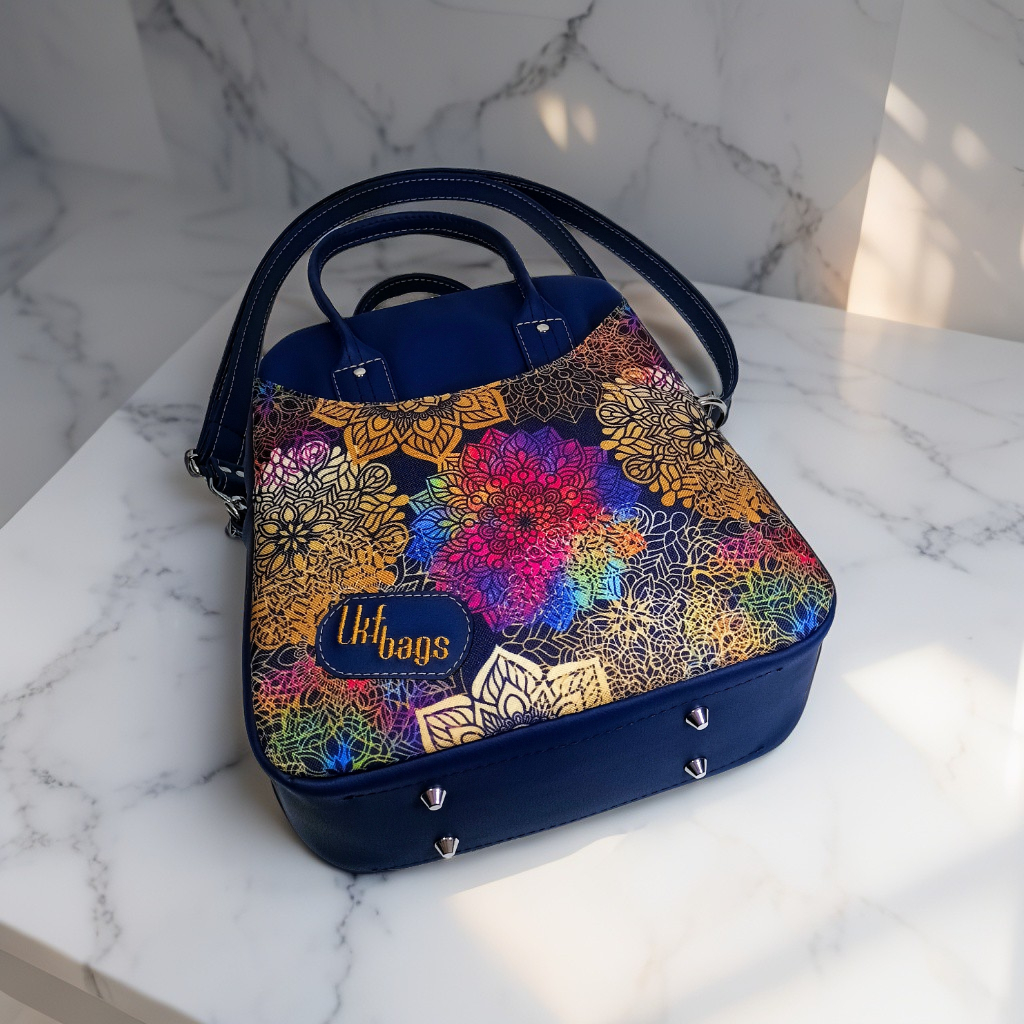 Středně velká kabelka ušitá z tmavě modré koženky a vzorované, nepromokavé látky, ozdobená vyšívaným logem.