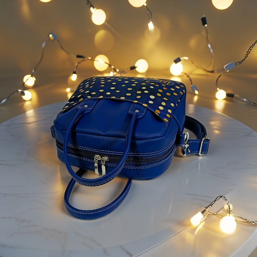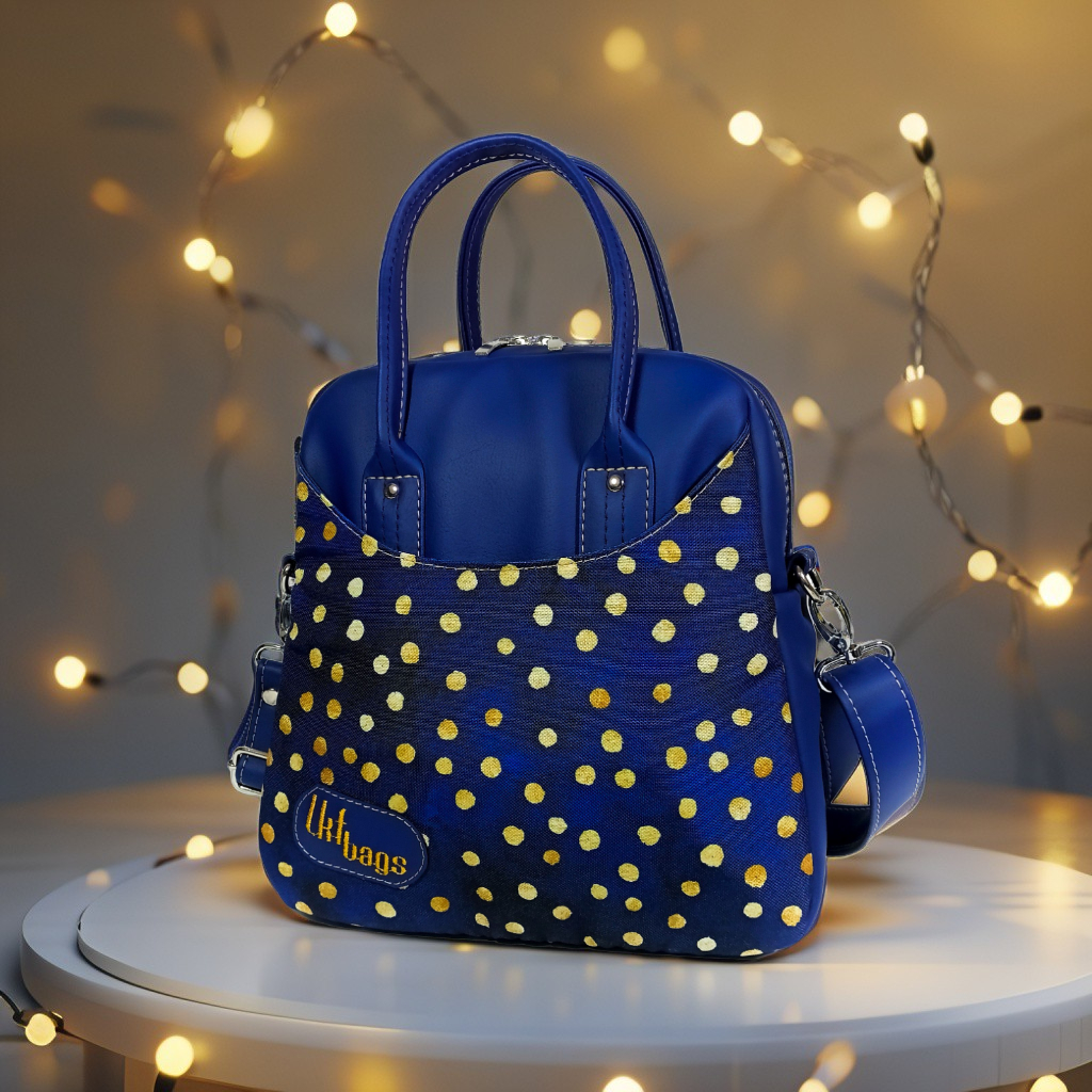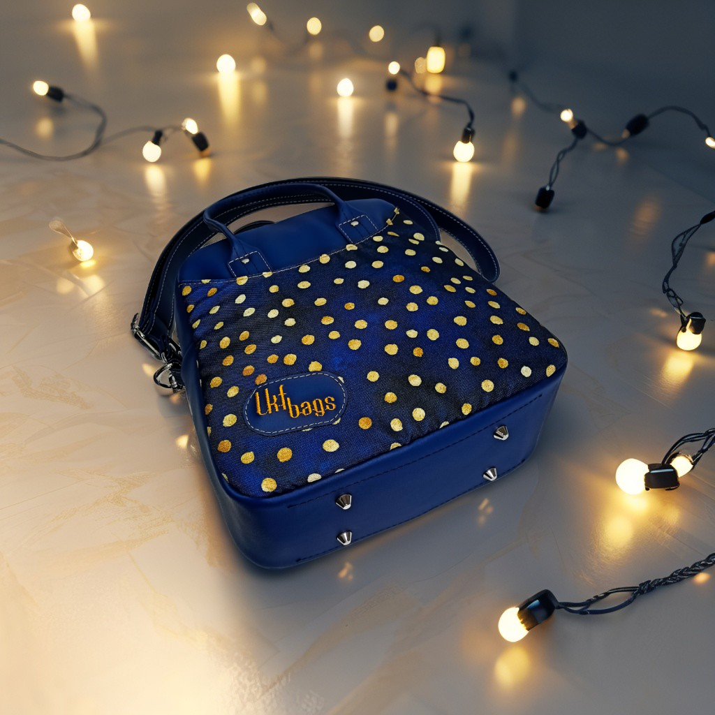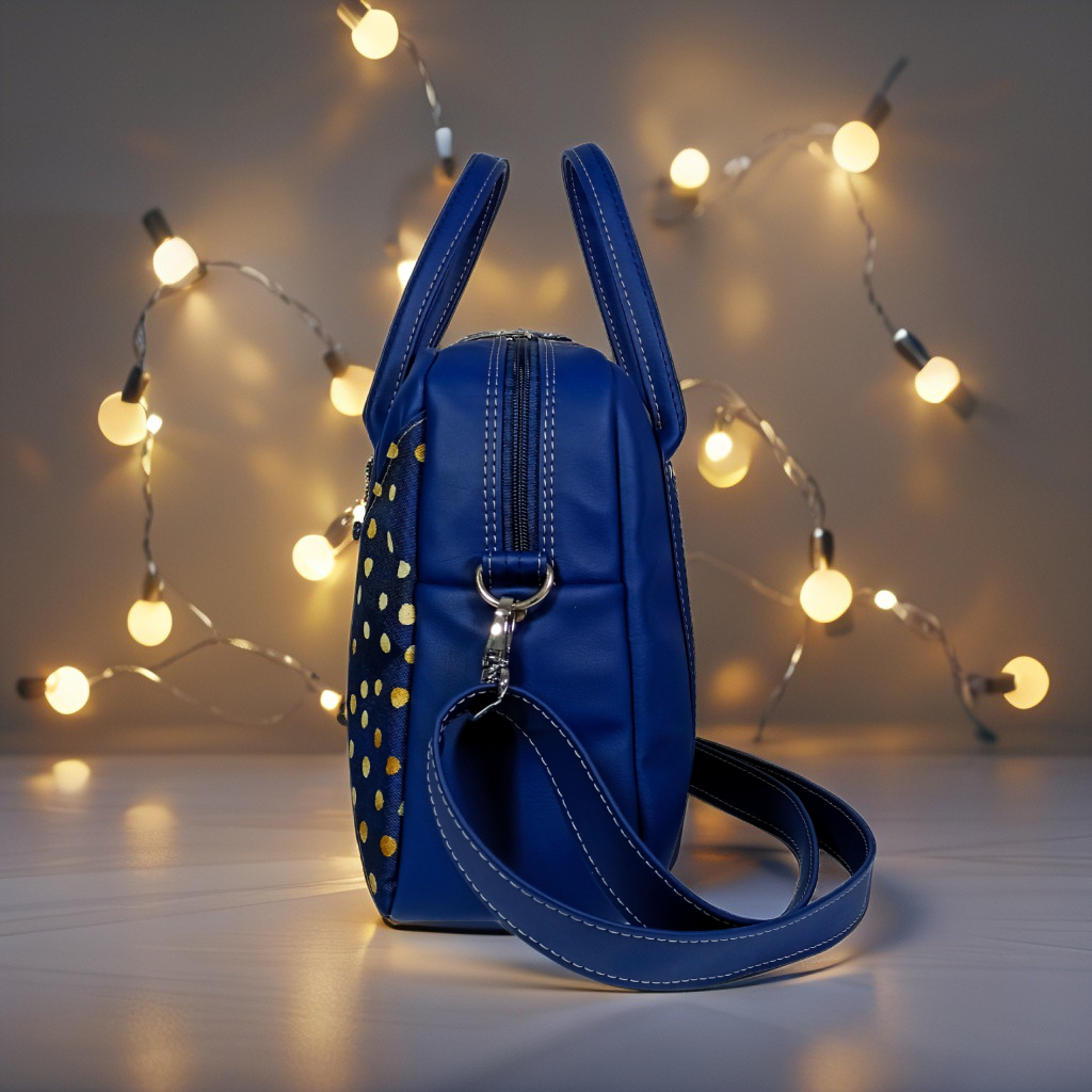 Středně velká kabelka ušitá z tmavě modré koženky a vzorované, nepromokavé látky, ozdobená vyšívaným logem.