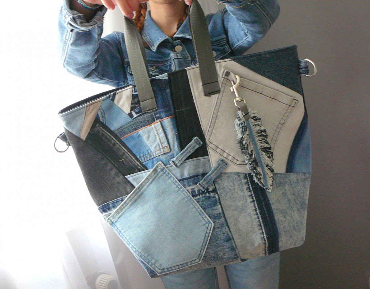 Kabelka ušitá z džínové recyklované látky, doplněná elementy z reci džínoviny. Vepředu jsou 2 kapsy zachované od původních riflí. Zapínání na magnet.