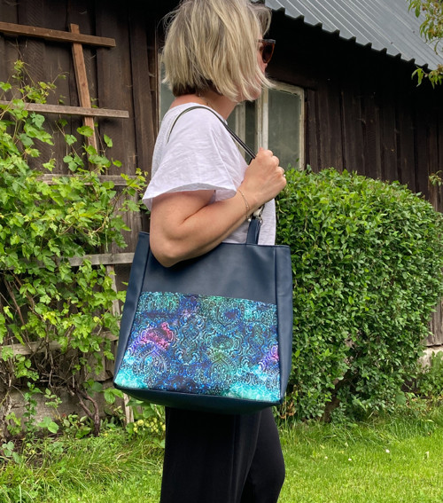 Materiál: Kvalitní tmavě modrá koženka v kombinaci s barevnou vzorovanou kočárkovinou