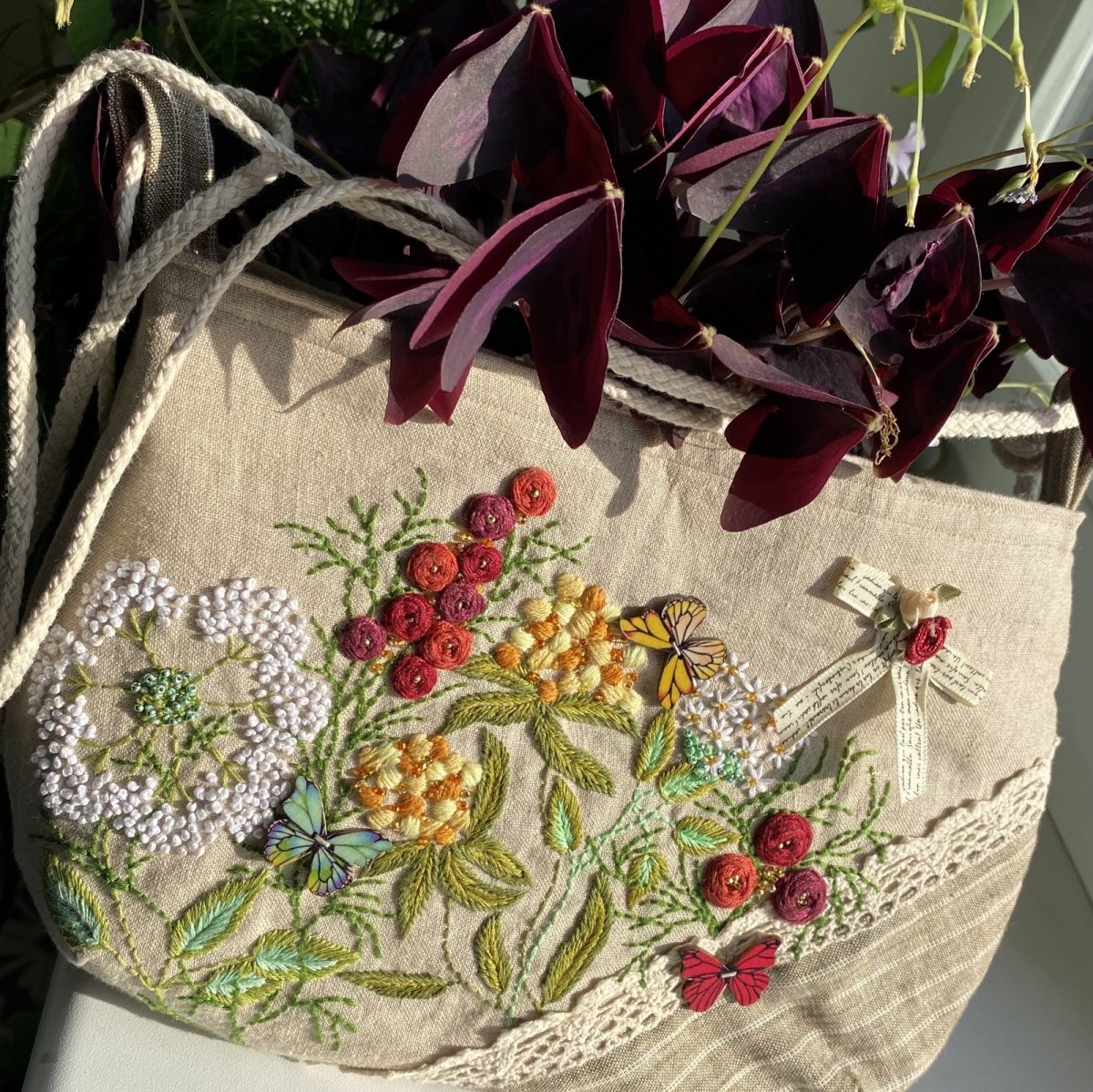 Přední díl je ručně vyšívaný z volné ruky, bez předlohy, tak jak si výšivka sama vedla ruku. Výšivka je doplněna bavlněnou krajkou a krásnými knoflíky - motýlky. Celá výšivka je doplněna spoustou korálků.