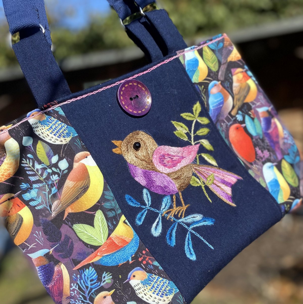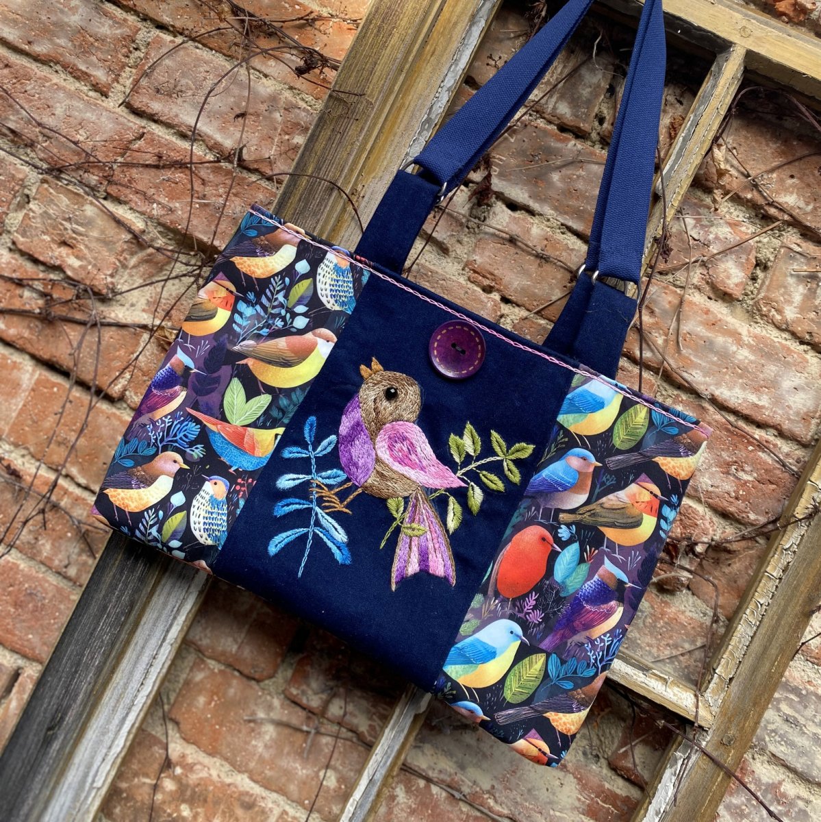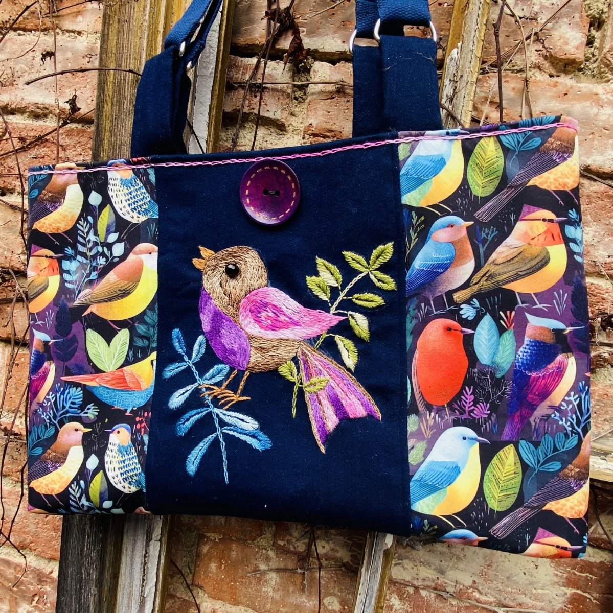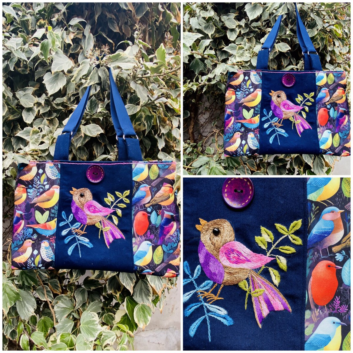 Střed předního dílu je ručně vyšívaný , motiv výšivky využil stylizovaně vzor na látce, ze které je kabela ušitá. Výšivka je na džínové látce.