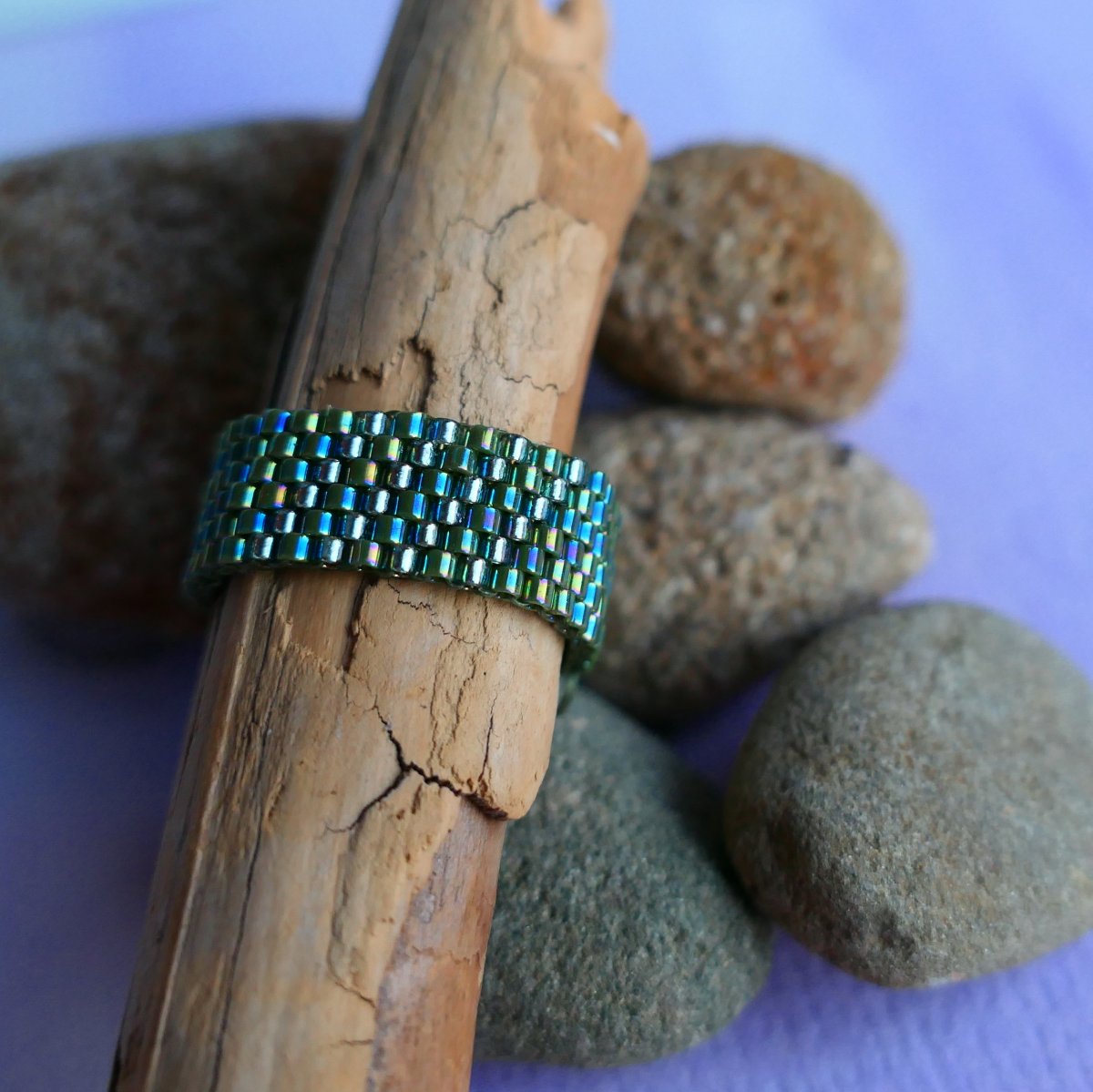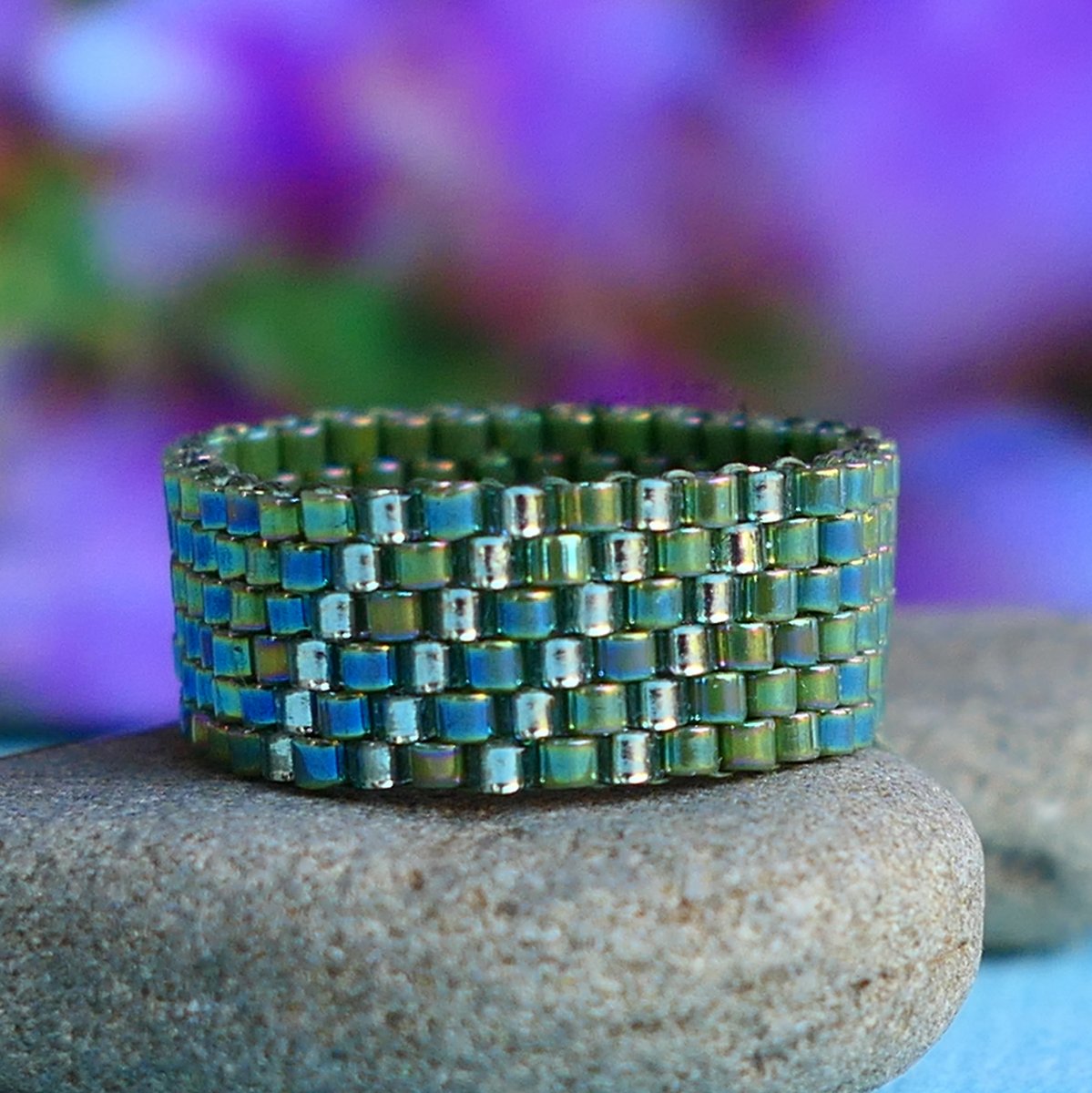Šitý prsten z velmi kvalitních japonských korálků Miyuki v barvě avokáda s kovovým pokovem. Vzor - čtyři proužky - je vytvořen zelenkavými korálky se stříbrným průtahem. Šířka prstenu 0,8 cm.