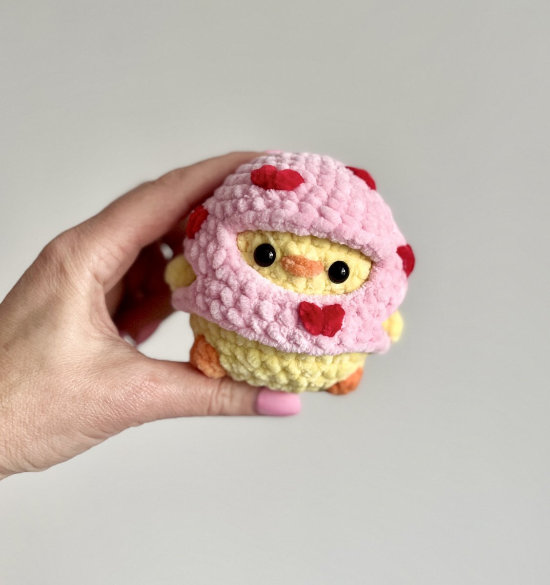 Malá háčkovaná kachnička oblečená do hebkého valentýnského kabátku plného srdíček. Jemné pastelové barvy, roztomilý zobáček a velké oči z ní dělají dokonalý dárek z lásky – pro děti i dospělé