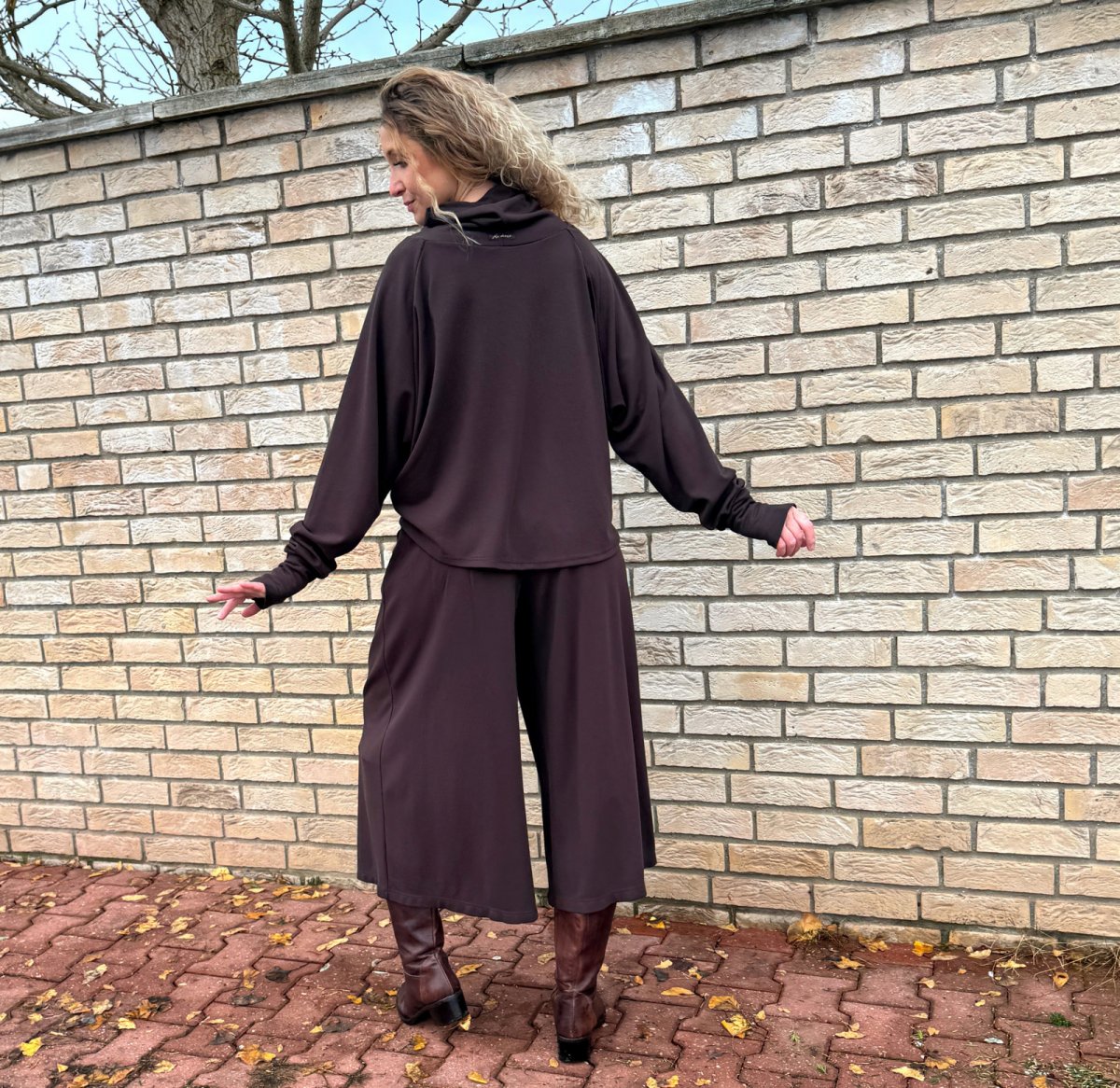 Široké kalhoty do zvonu. Na první pohled působí jako sukně. Kalhoty jsou ušité ze středního úpletu vis/pes/elast.