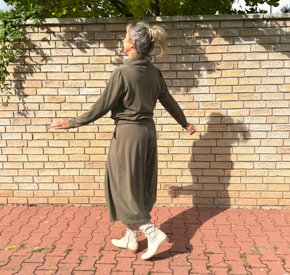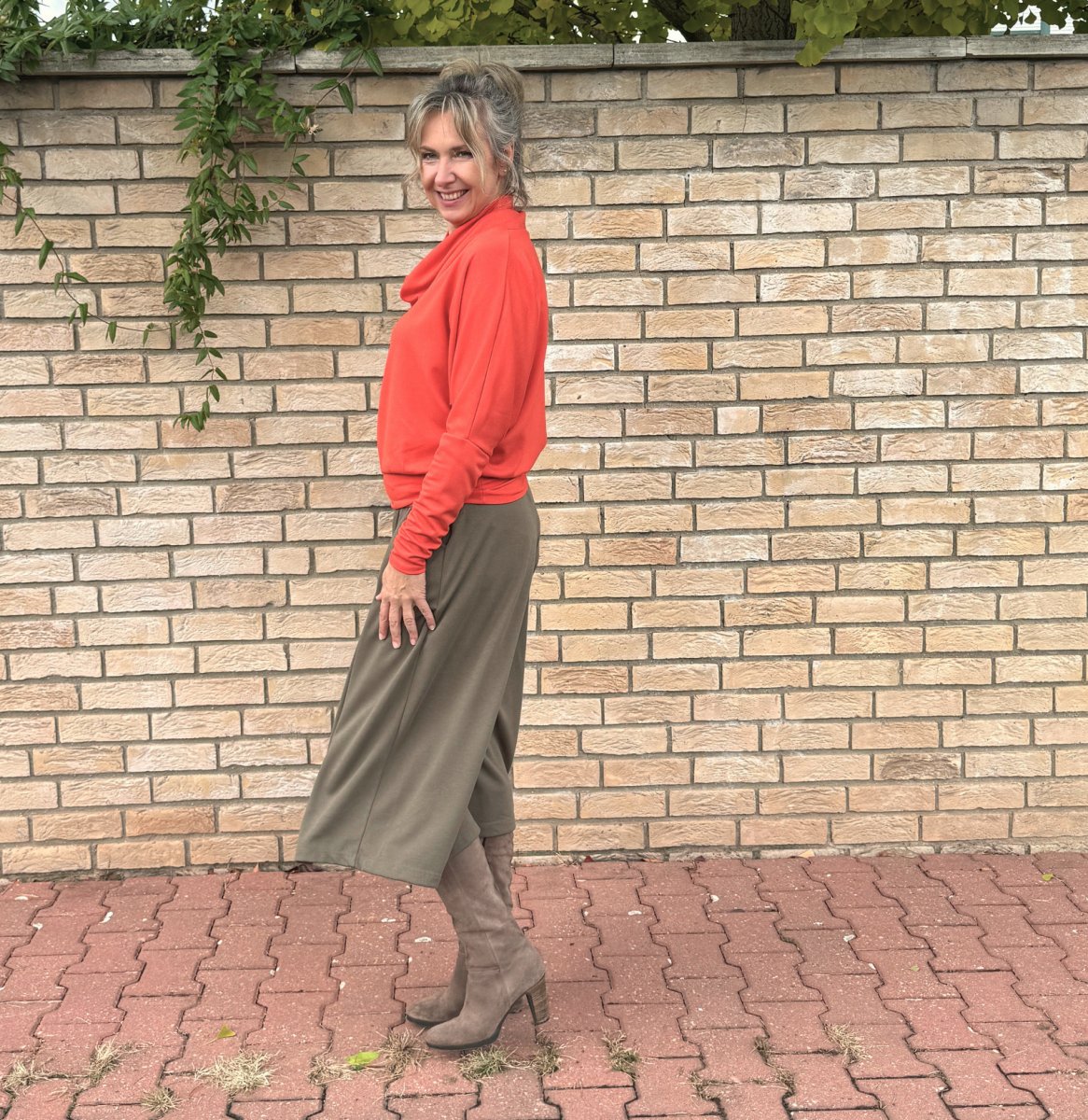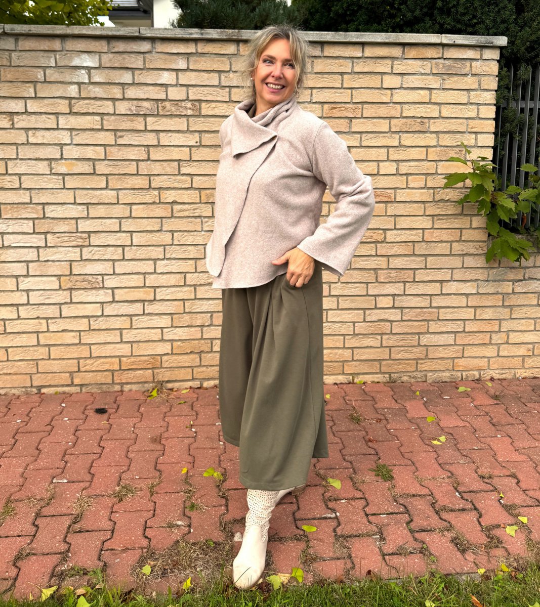 Široké kalhoty do zvonu. Na první pohled působí jako sukně. Kalhoty jsou ušité ze středního úpletu vis/pes/elast.