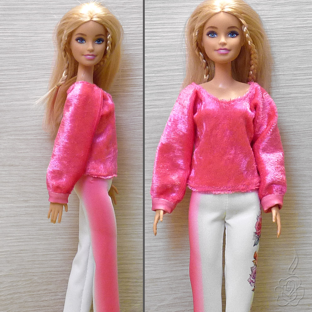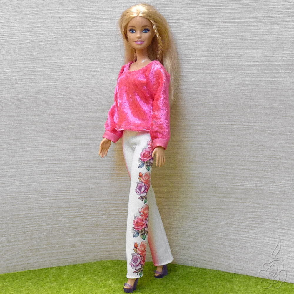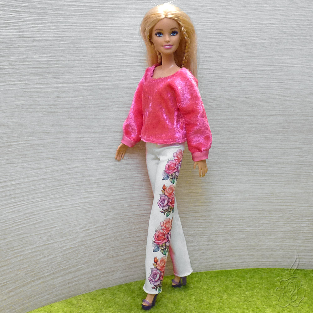 Barevné kalhoty a sytě růžová sametová mikina pro panenku Barbie.