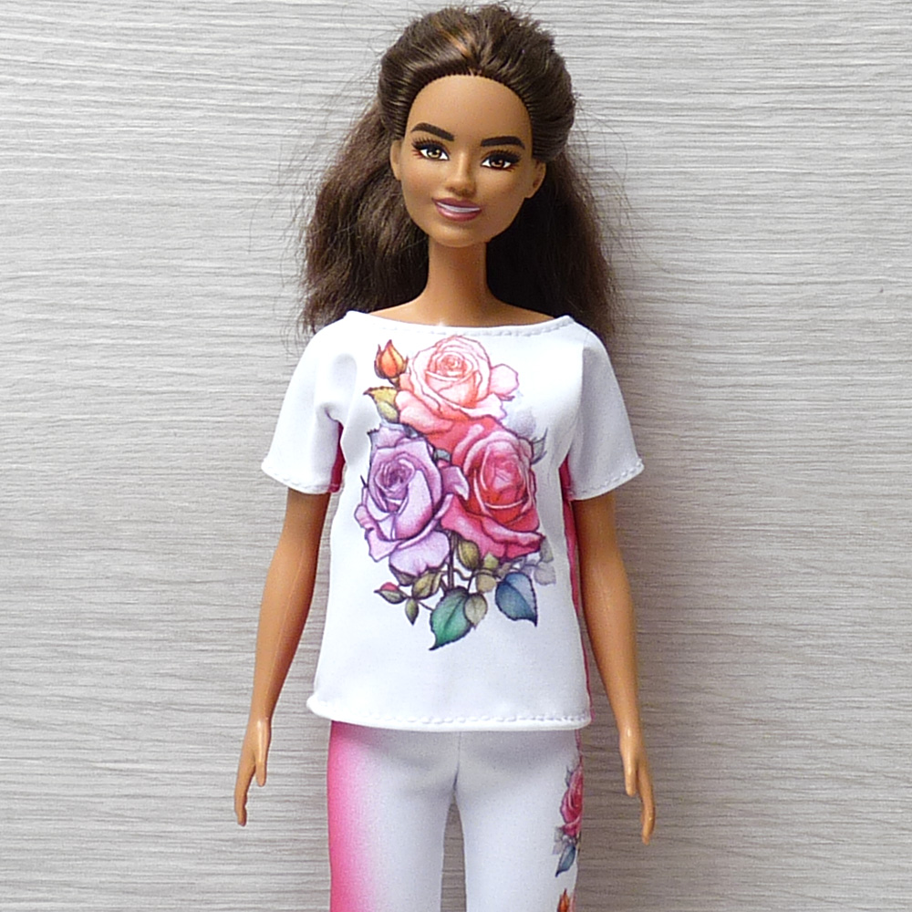 Barevný komplet s růžemi - kalhoty a delší triko pro panenku Barbie.