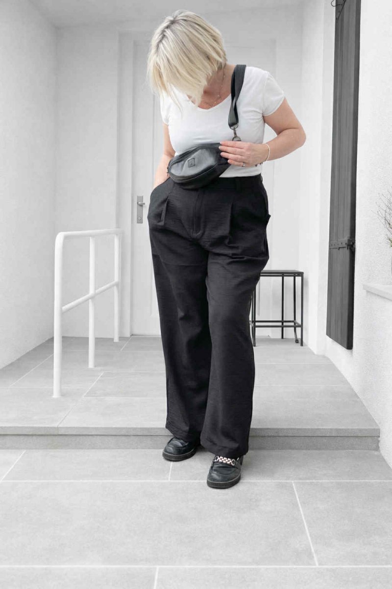 Černé dámské kalhoty jsou univerzálním a pohodlným kouskem do každodenního šatníku. Jsou navrženy tak, aby se daly nosit jak ve volném čase, tak i ke stylovějším outfitům.