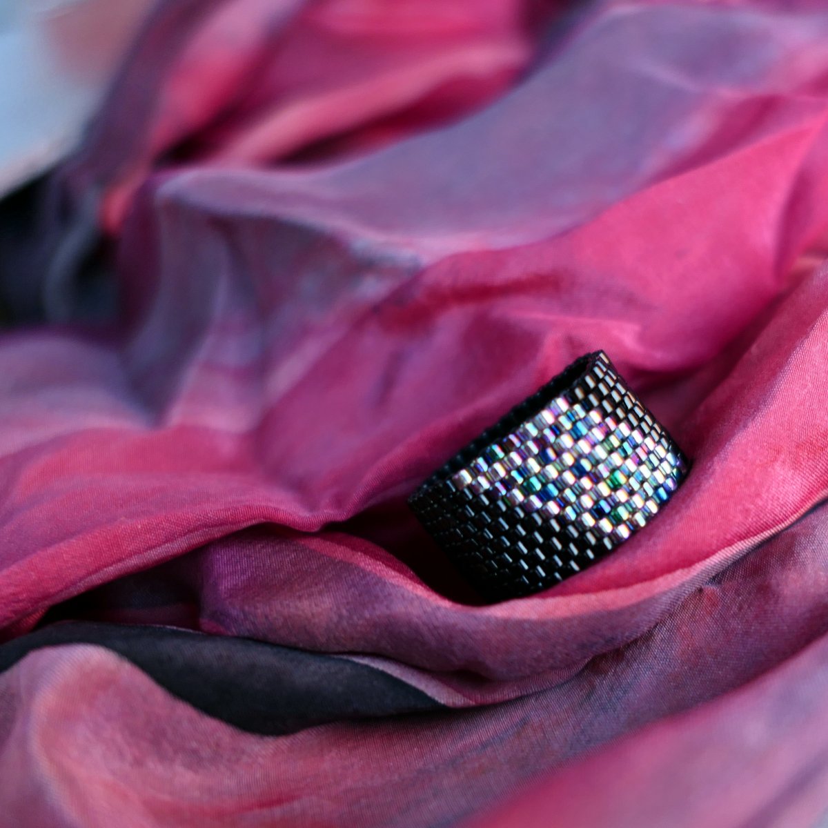Šitý prsten z velmi kvalitních japonských korálků Myiuki střední velikosti v barvě černé. Vzor je tvořen směsí metalických korálků. Pokud je zvolena správná velikost, prsten se neprotáčí. Šířka prstenu 1,2 cm - pro majitelky dlouhých prstů bude jako stvořený.