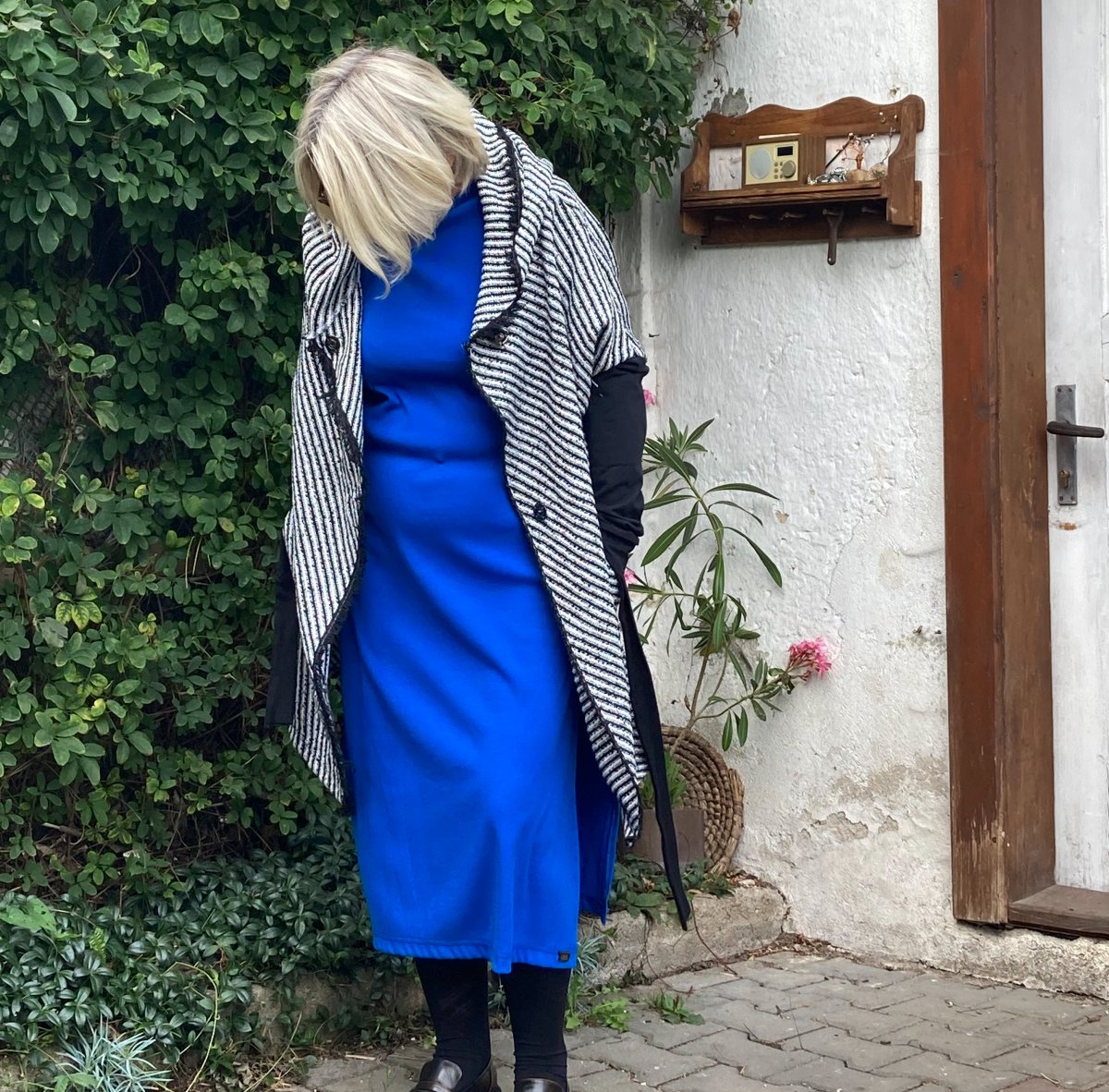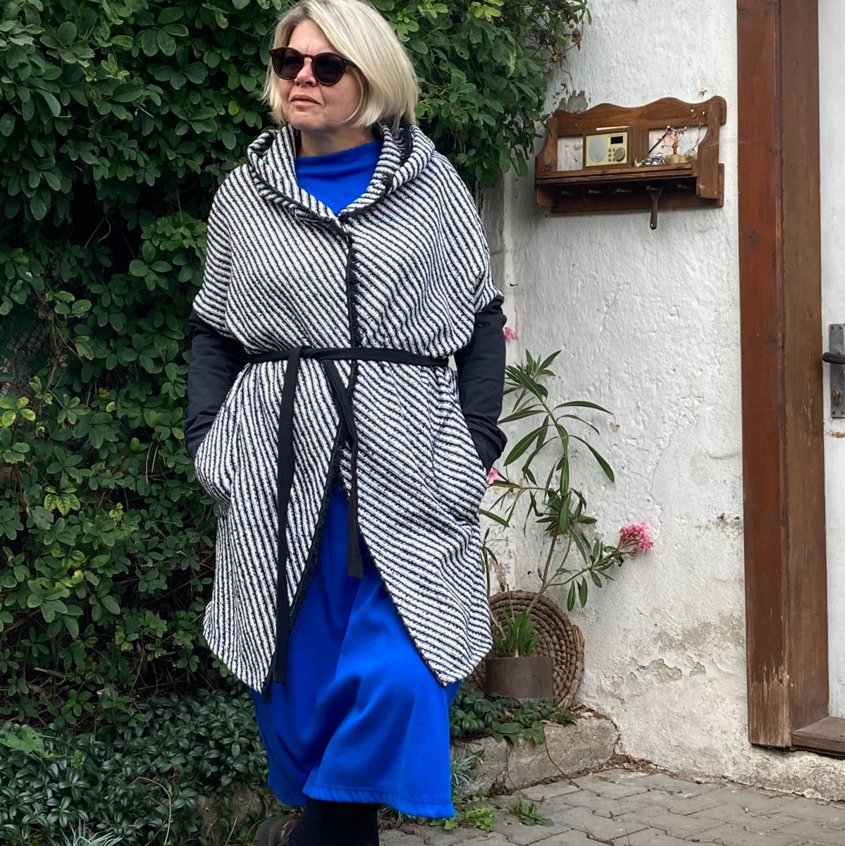 Delší kardigan z pevnější pleteniny v černobílé barevnosti.