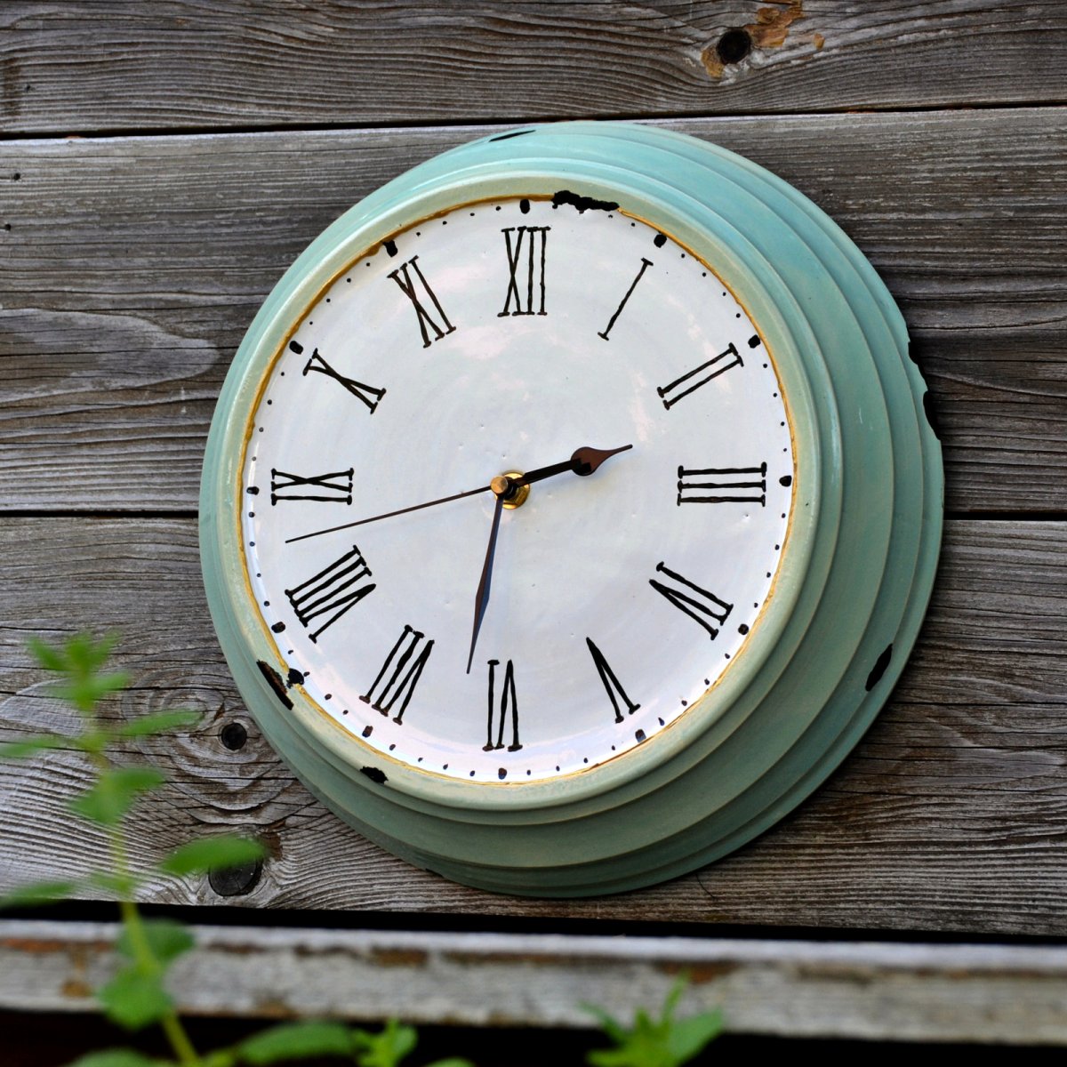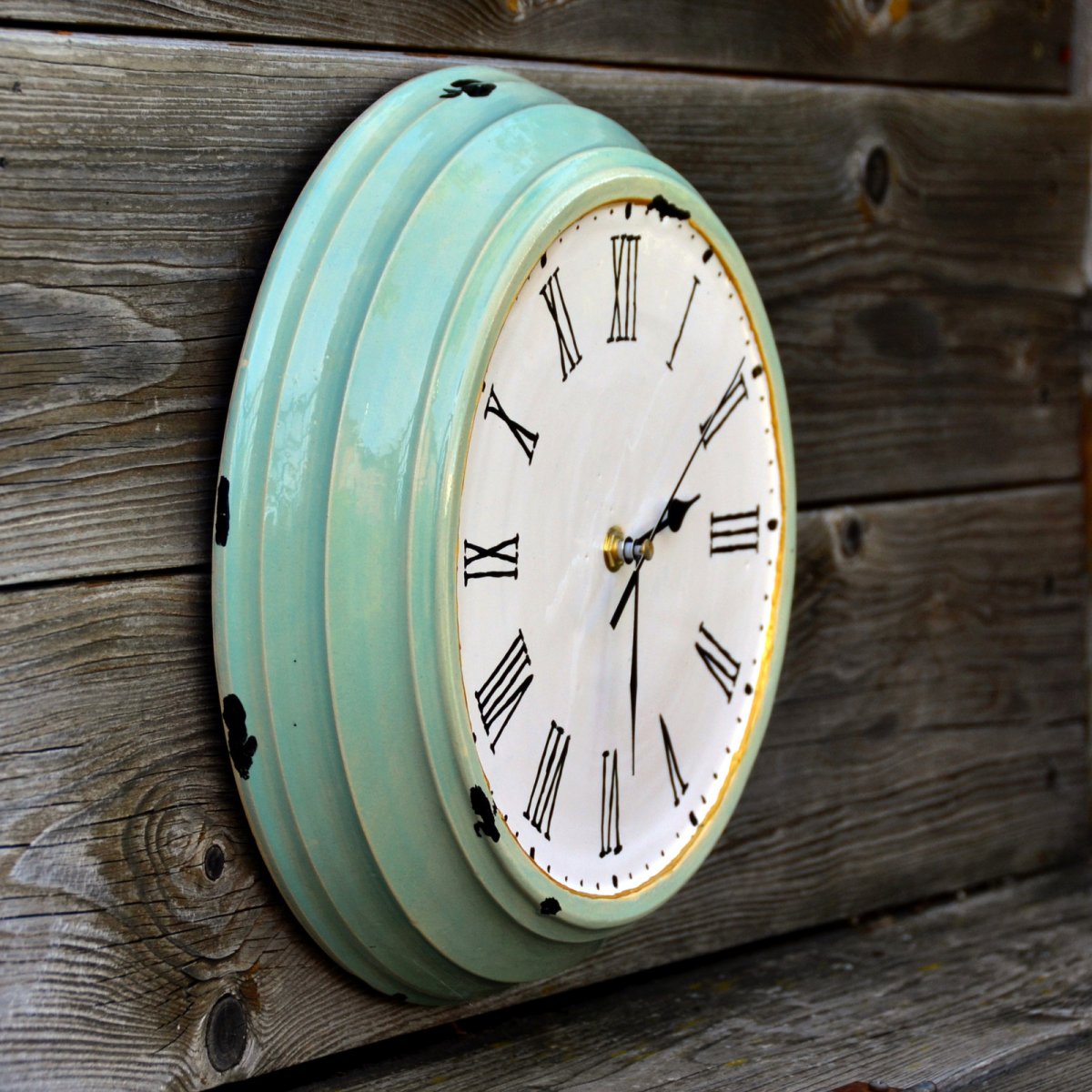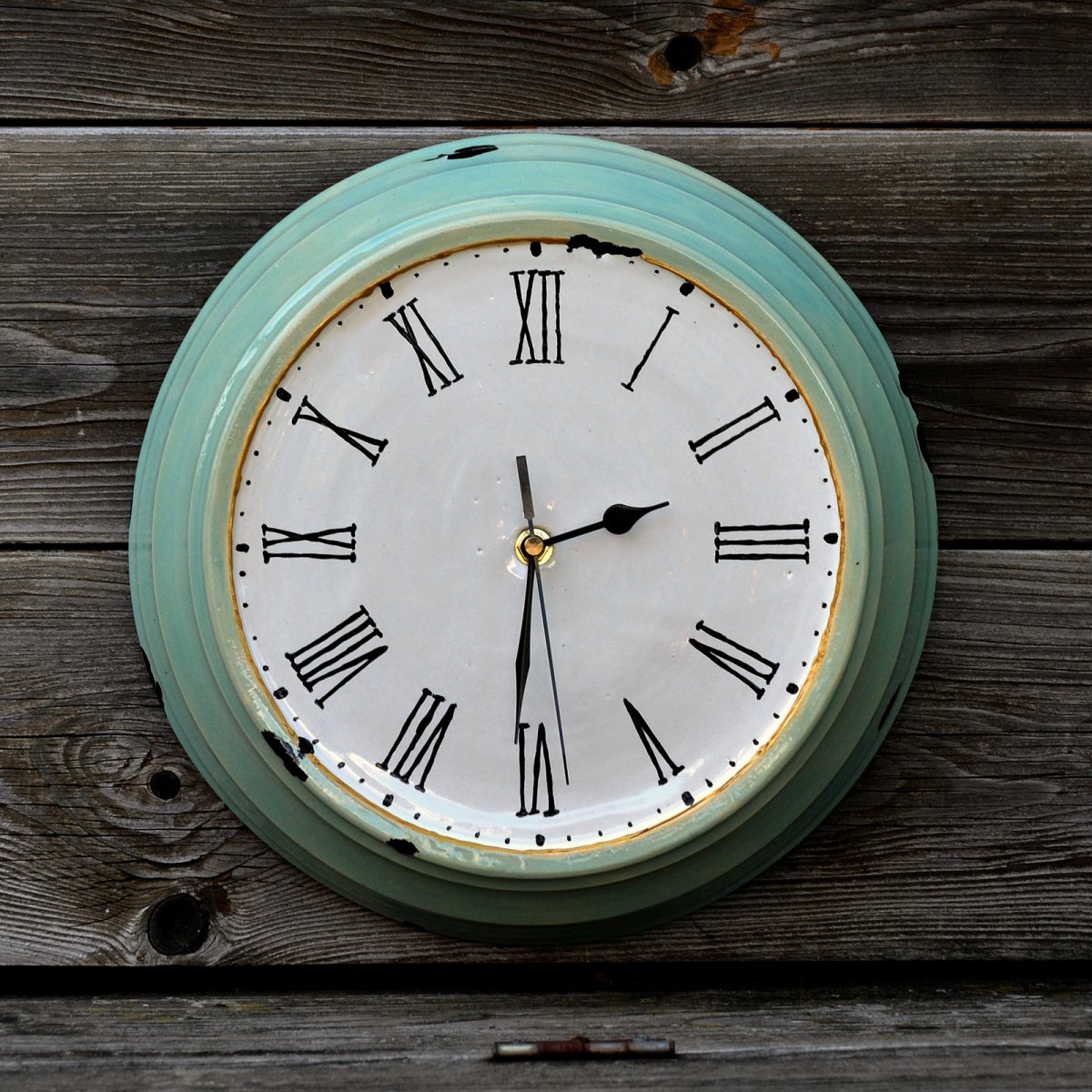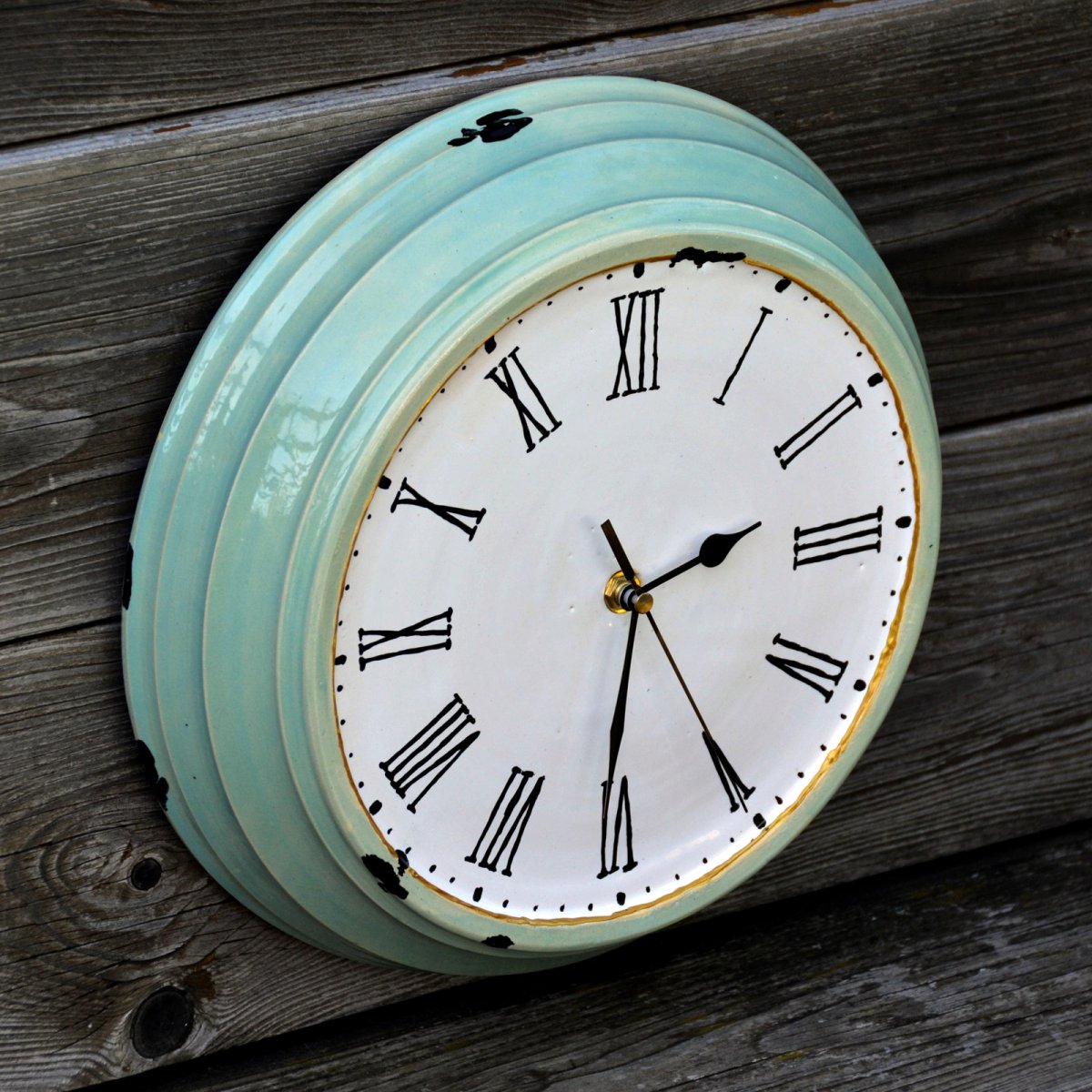 Keramické hodiny vytvořené na hrnčířském kruhu. Vintage design ve stylu smaltovaného, plechového výrobku.