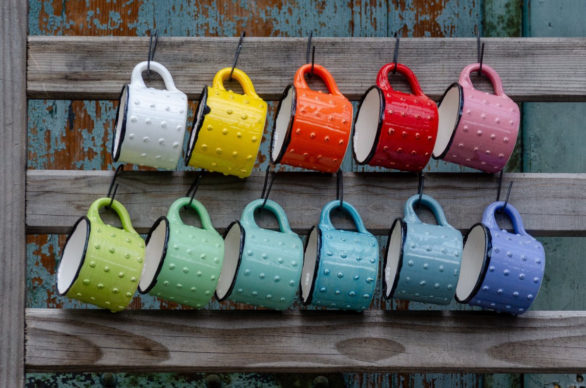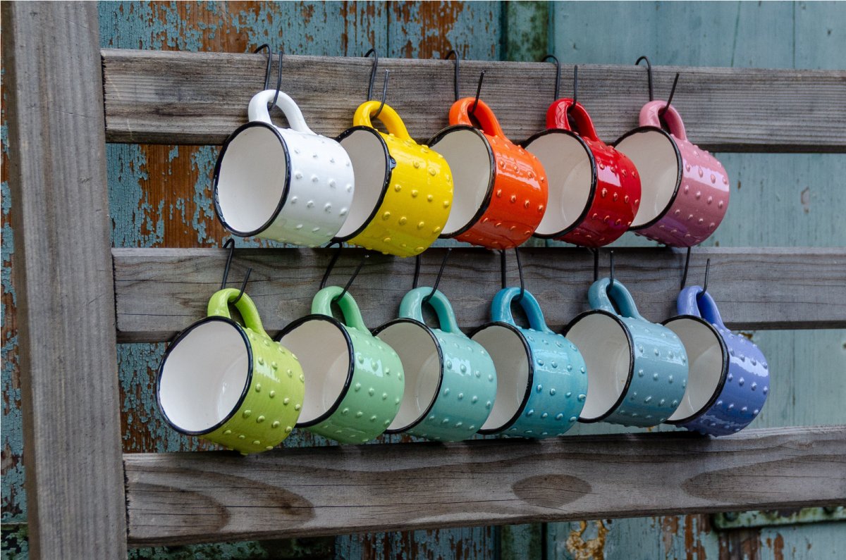 Keramický hrneček v plechovém stylu je vyrobený na hrnčířském kruhu. Uvnitř je glazován bílou glazurou. Vnější glazura v různých barvách je doplněna černou linkou a plastickými "pupínky". Všechny glazury jsou zdravotně nezávadné.