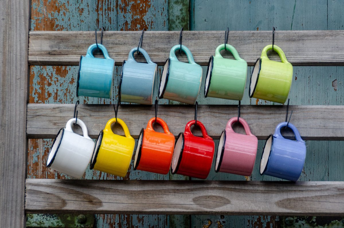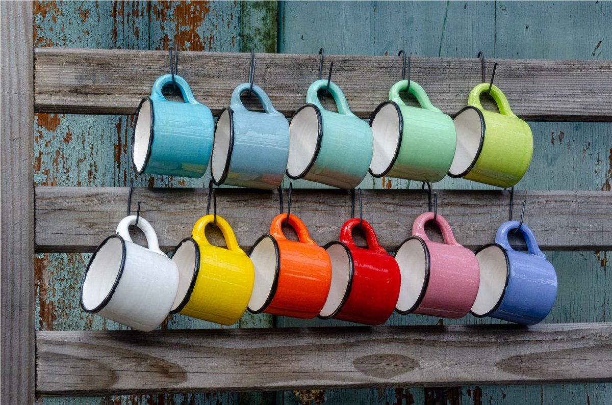Keramický hrneček v plechovém stylu je vyrobený na hrnčířském kruhu. Uvnitř je glazován bílou glazurou. Vnější glazura v různých barvách je doplněna černou linkou. Všechny glazury jsou zdravotně nezávadné.