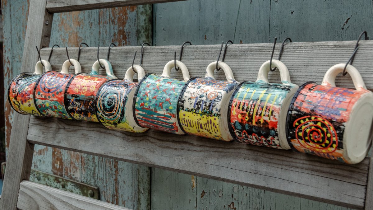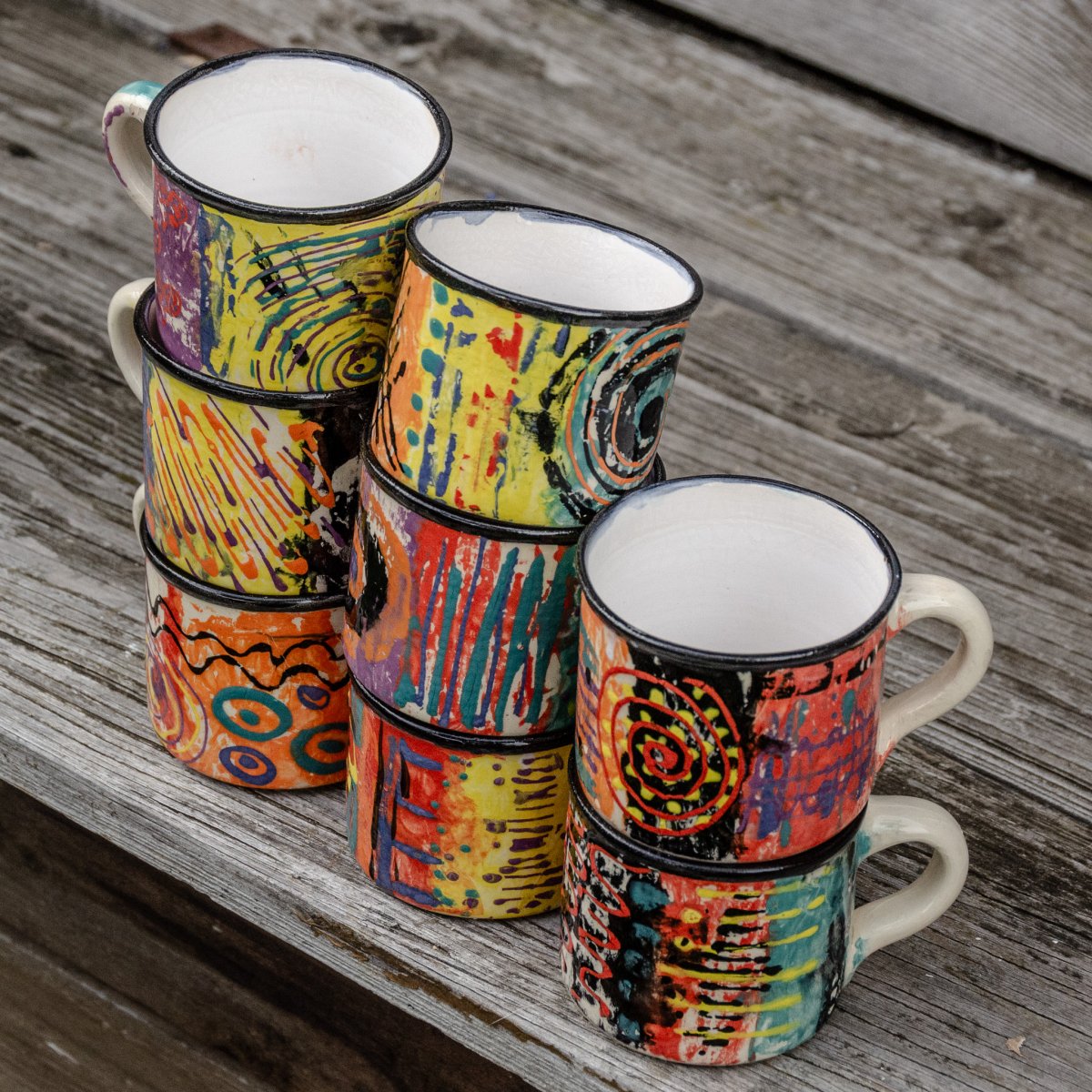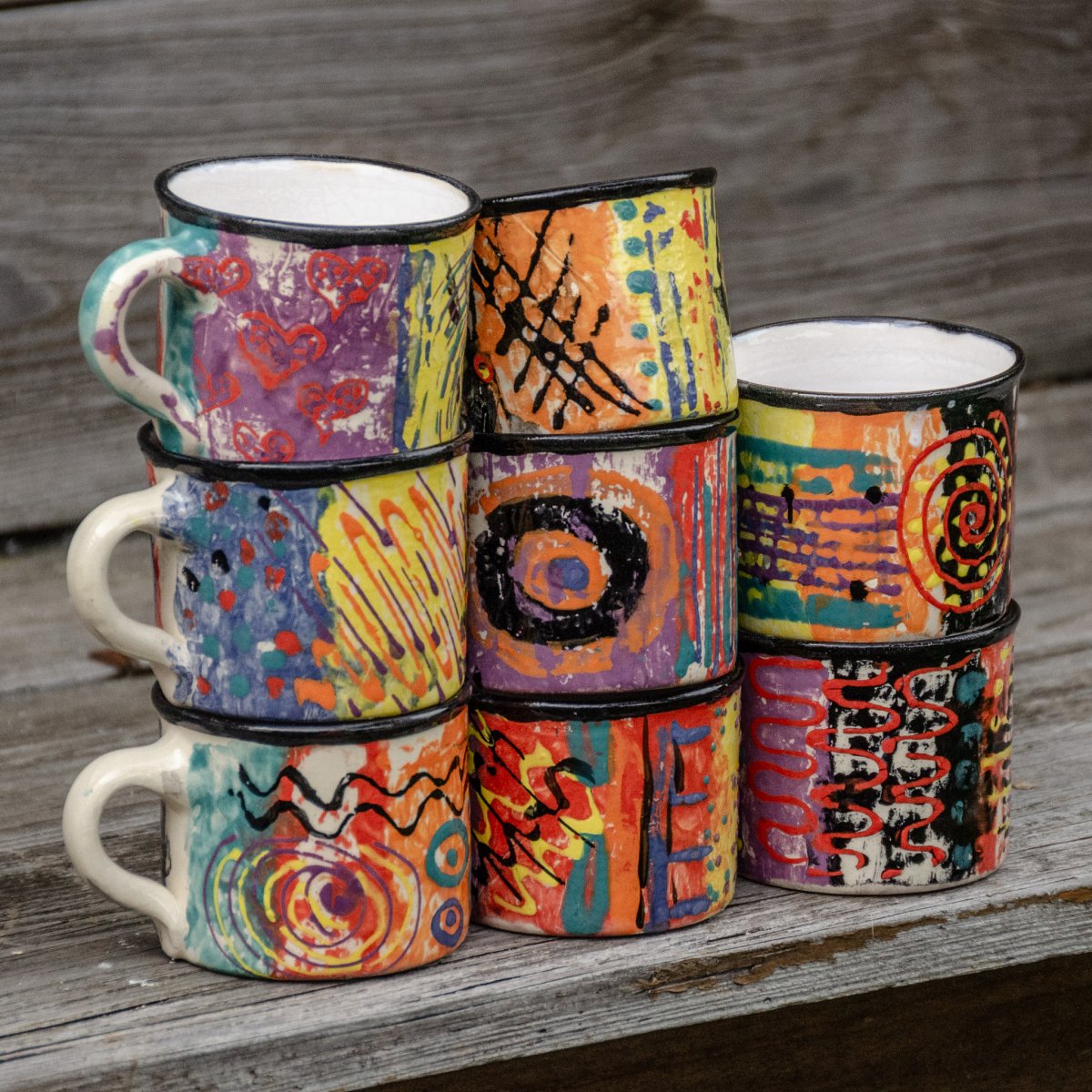 Hrnky v „plechovém" vintage designu vytvořené na hrnčířském kruhu. Vnitřní glazura bílá, vnější dekor podglazurními engobovými obtisky a transparentní glazurou.