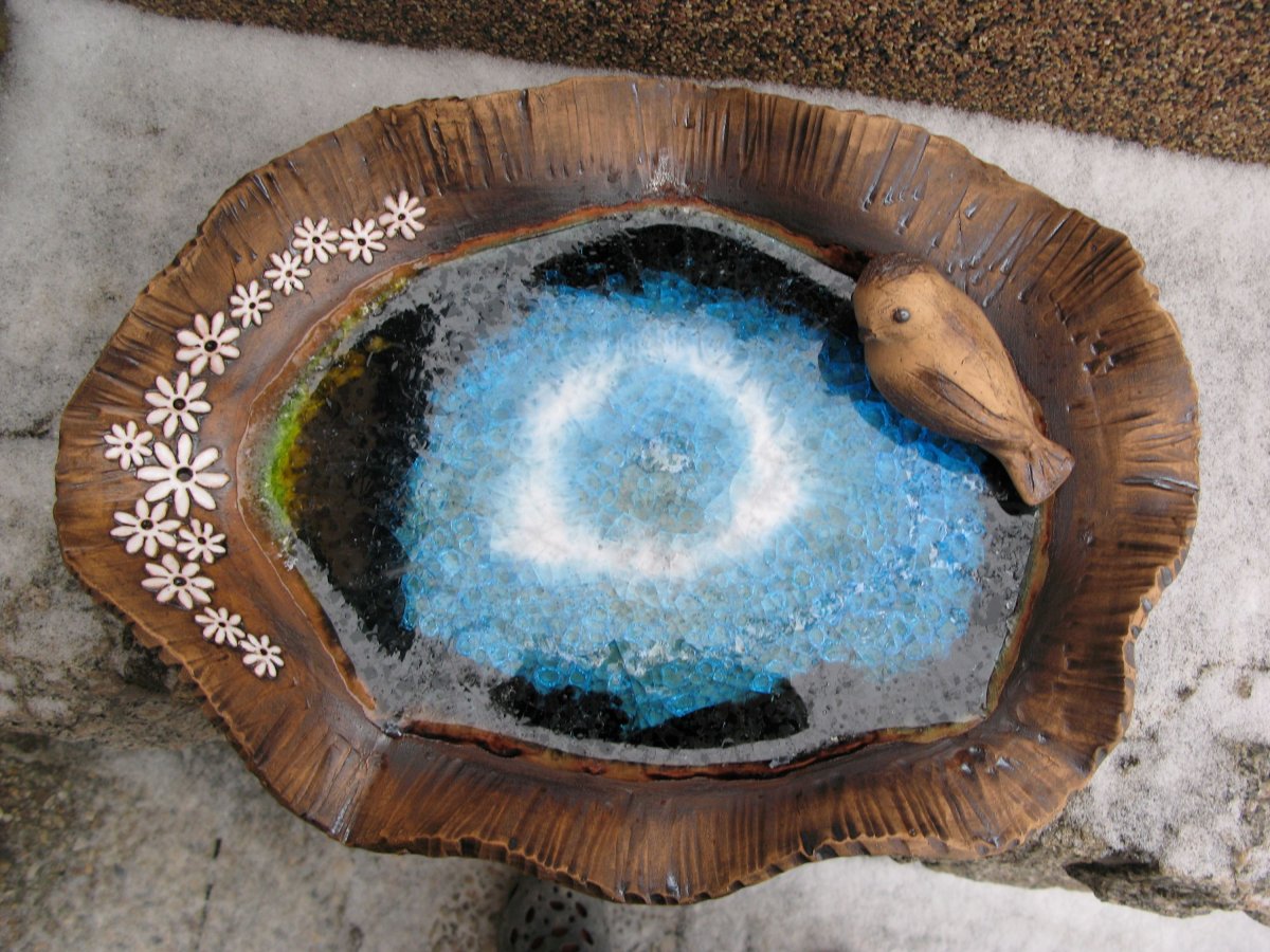 Keramický ptáček není pevně spojen s miskou, můžete ho libovolně aranžovat. Ptáčka můžete vedle pítka zapíchnou na tyčku-má zespoda dirku nebo ho použijete k jiné dekoraci.
