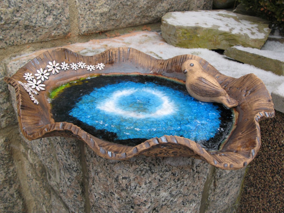 Zahradní keramické pítko - velká mísa s ptáčkem