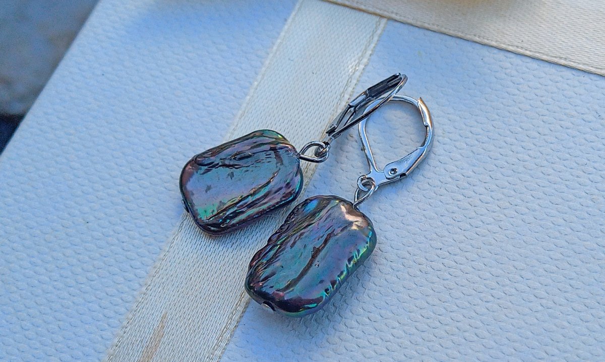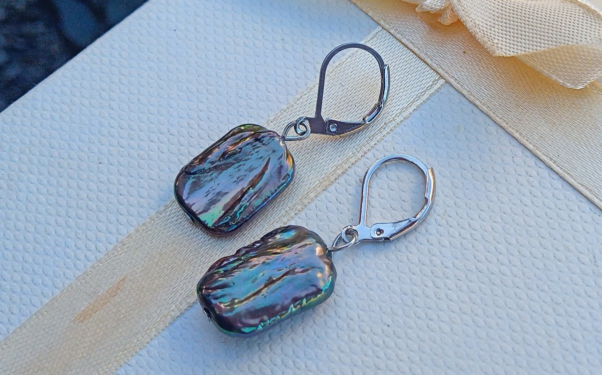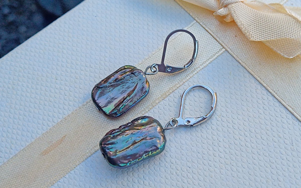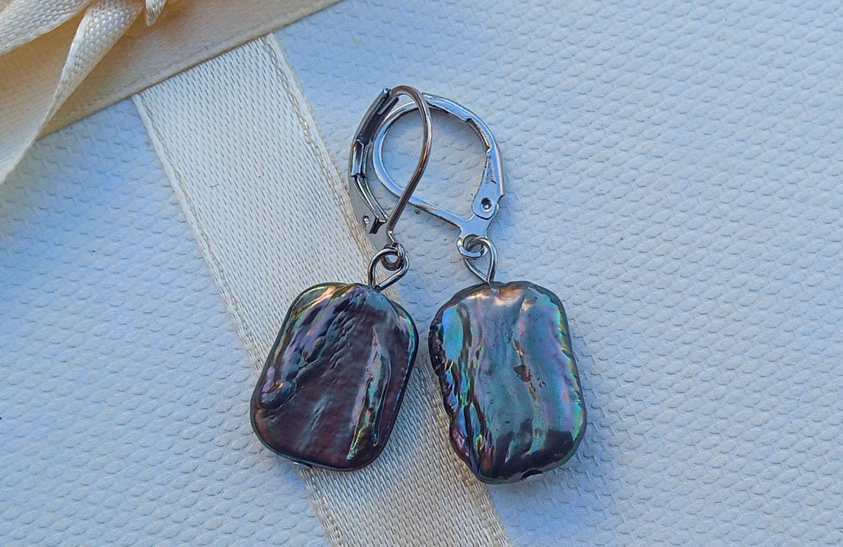 Nádherně perleťové dokonale lesklé černé mořské keshi perly v top kvalitě ve tvaru obdélníků 18x12 mm zavěšené na zavíracích háčcích z chirurgické oceli - hypoalergenní, vhodné i pro alergiky.