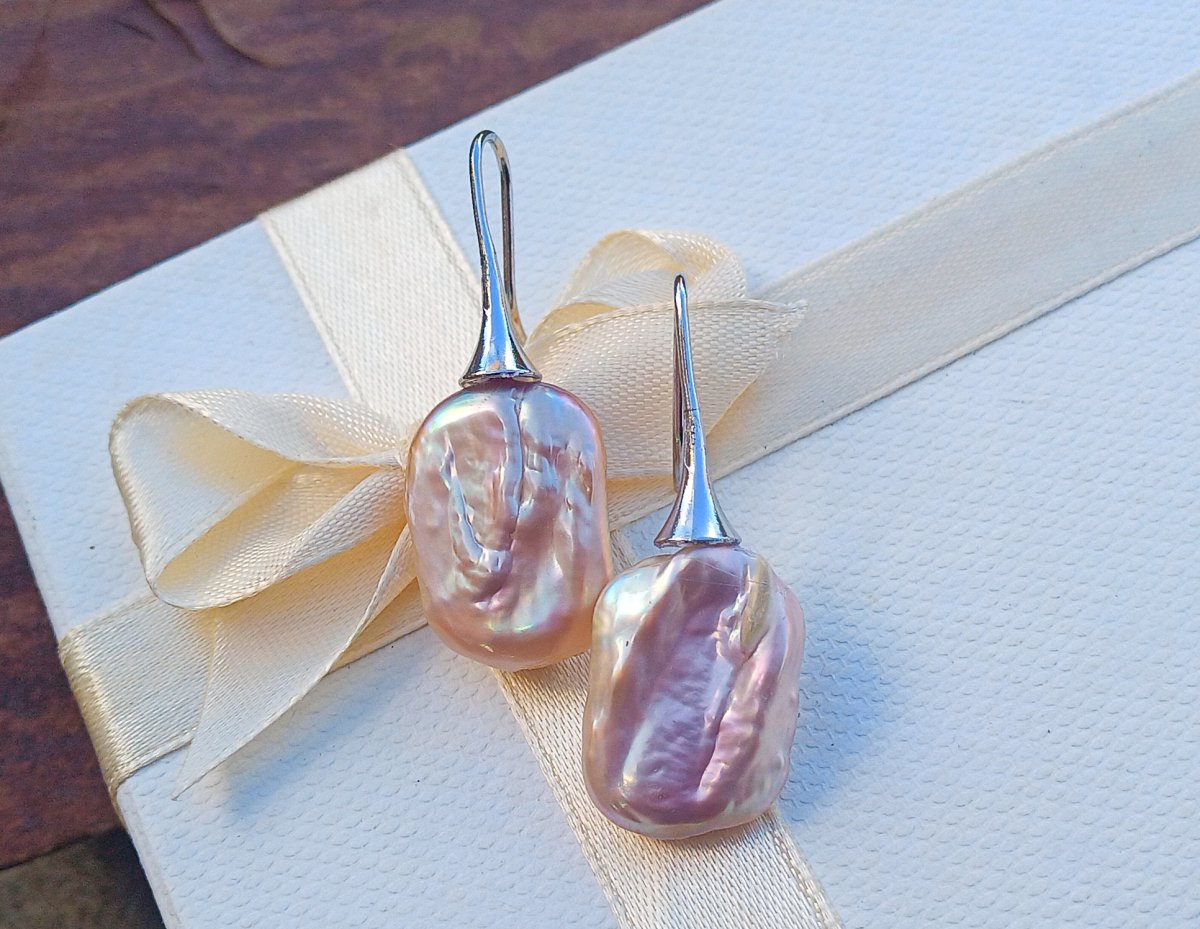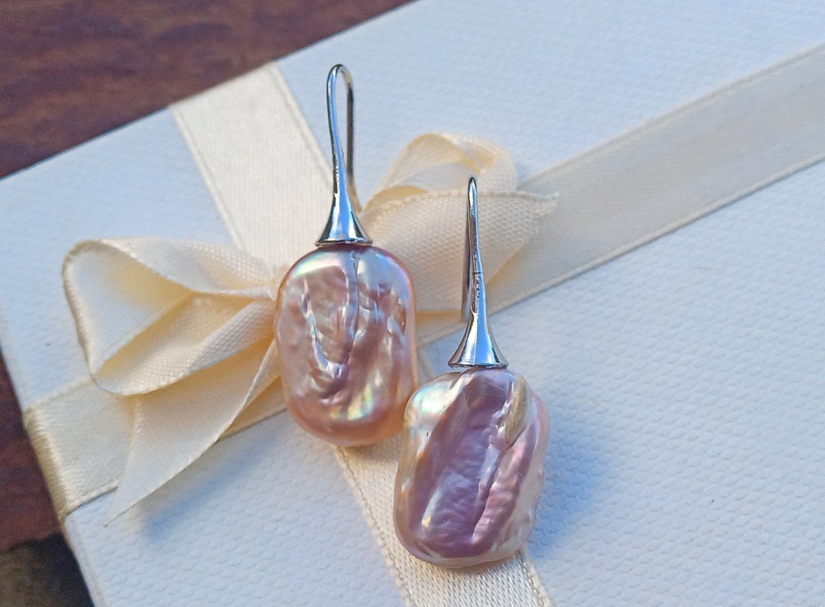 Nádherně perleťové dokonale lesklé fialkové mořské keshi perly v top kvalitě ve tvaru obdélníků 20x16 mm zavěšené na elegantních háčcích z chirurgické oceli - hypoalergenní, vhodné i pro alergiky.