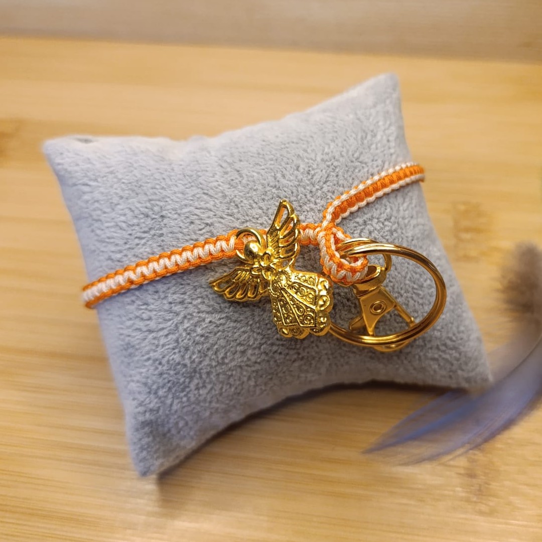 Poutko na klíče tkané technikou macramé z nylonové šňůrky odstínů oranžové a vanilkové.