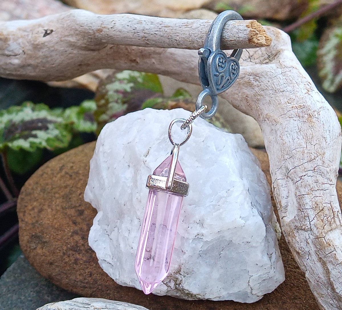 Přívěsek na klíče, nebo batoh, kabelku atd. vyrobený z růžového křišťálu zavěšeného na ozdobné karabince ve tvaru srdíčka s celkovou délkou 7 cm.