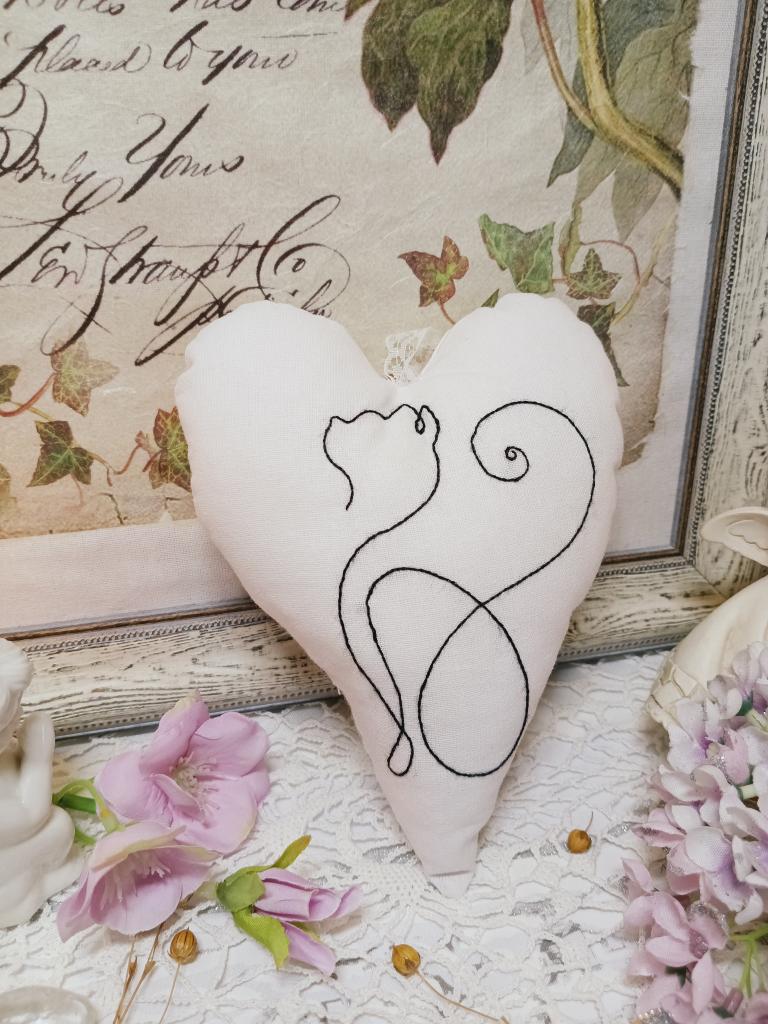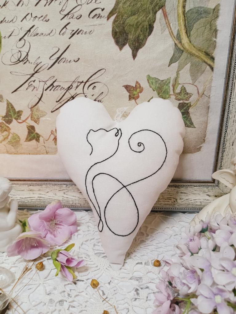 Ručně vyšívané srdíčko plněné dutým vláknem a sáčkem s levandulí. Srdíčko je dekorované jednoduchým motivem kočky a z druhé strany vzorem minnie mouse s modrou mašlí. Srdíčko je opatřené stužkou na zavěšení.