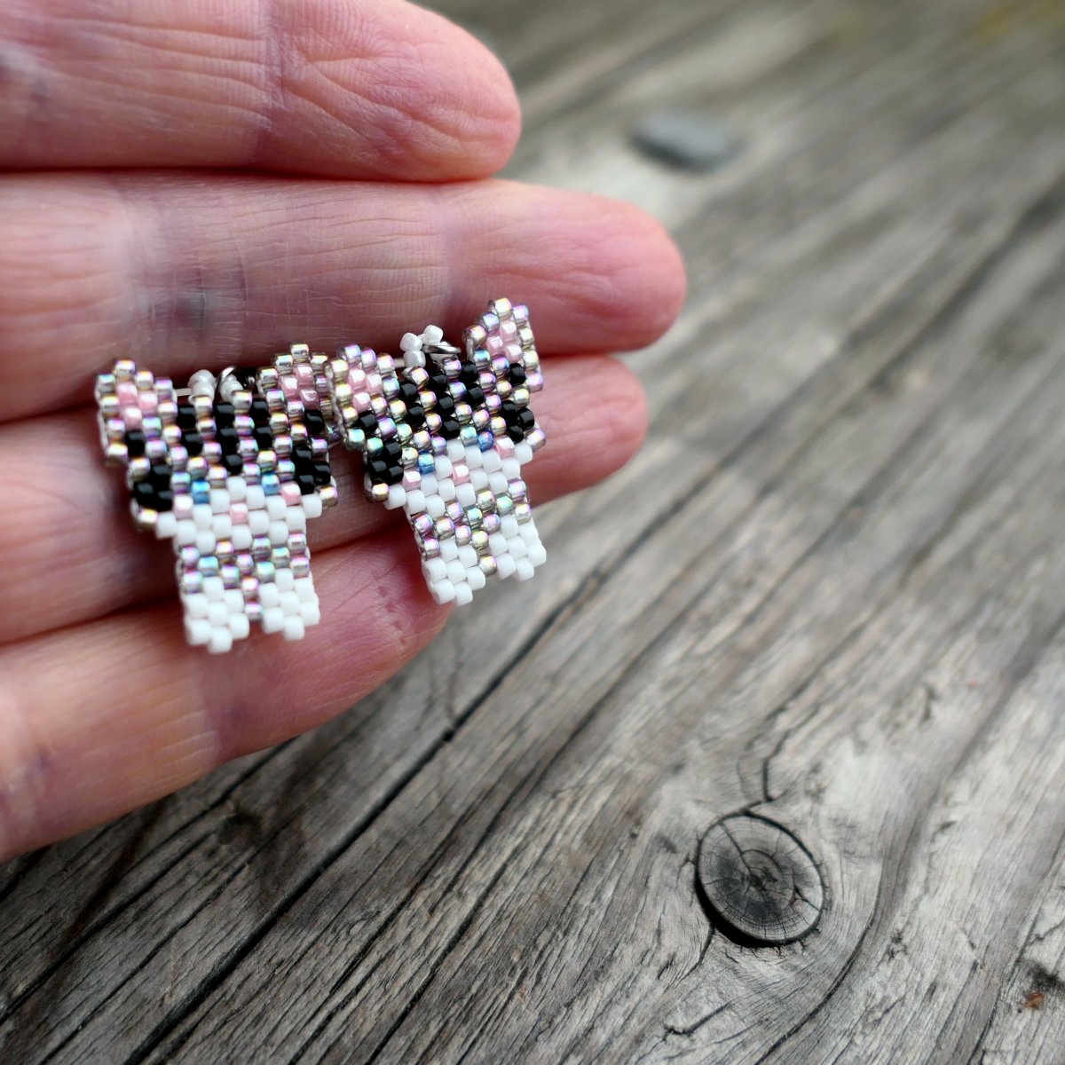 Ušito z japonského rokailu Myiuki barvy bílé, šedé s duhovým pokovem, modrá a růžová, šito nití Superlon.
