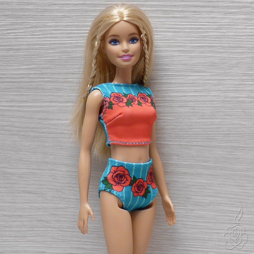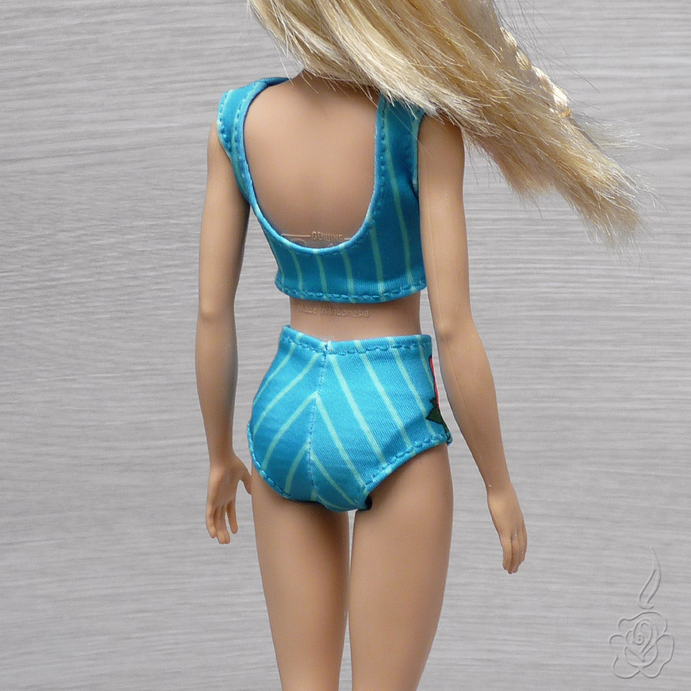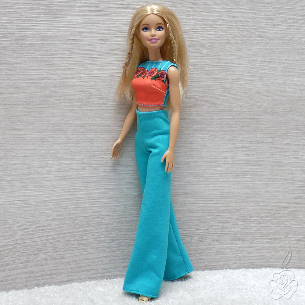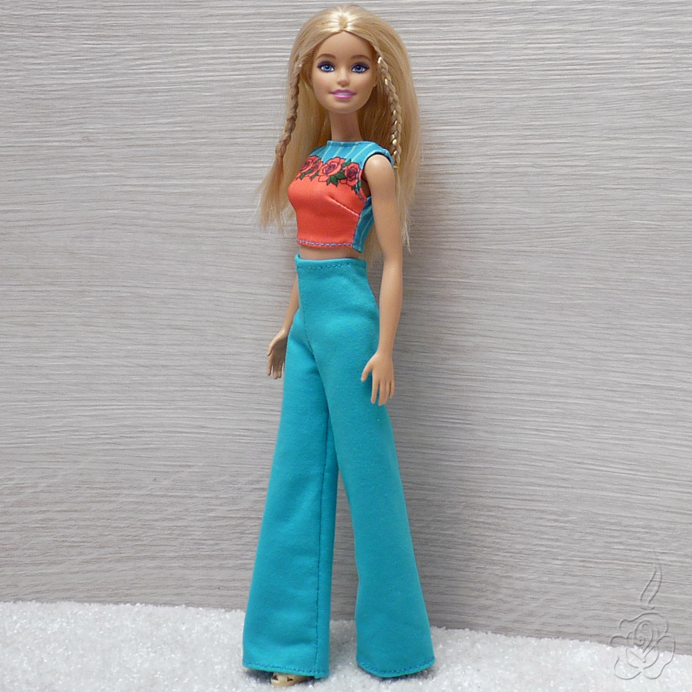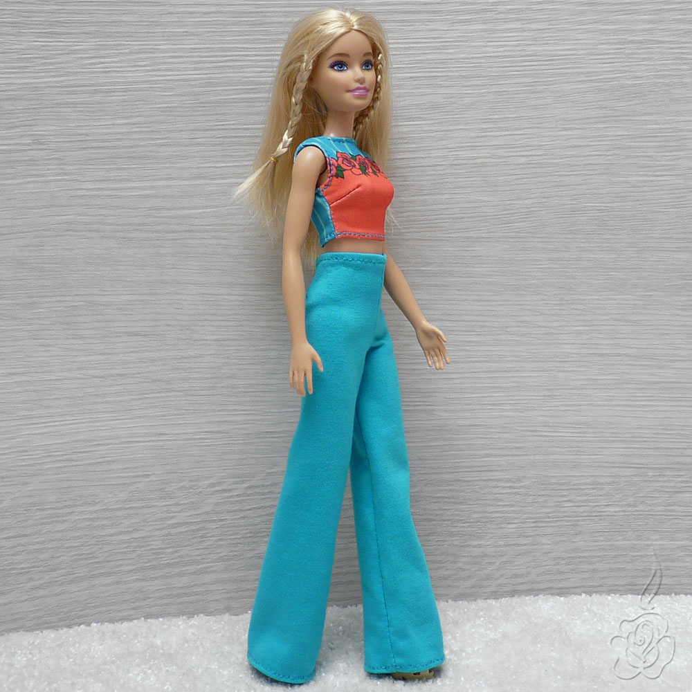Tyrkysové široké kalhoty, barevný top a kalhotky pro Barbie. (Topík a kalhotky může Barbie nosit i jako plavky)
