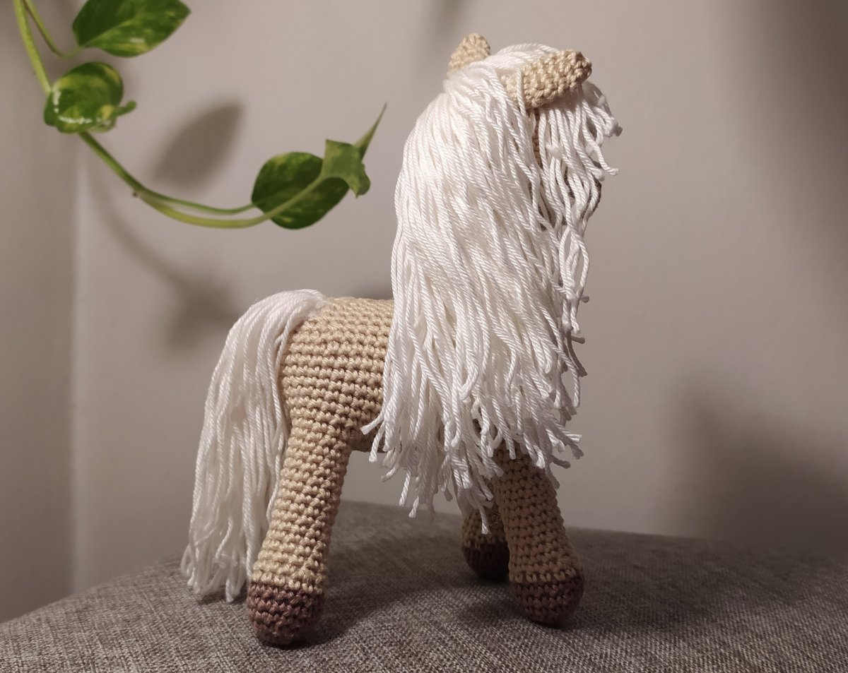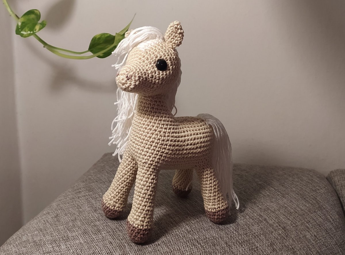 Koník je uháčkovaný ze 100% bavlněné příze, bezpečnostní očka. Velikost cca 20cm.