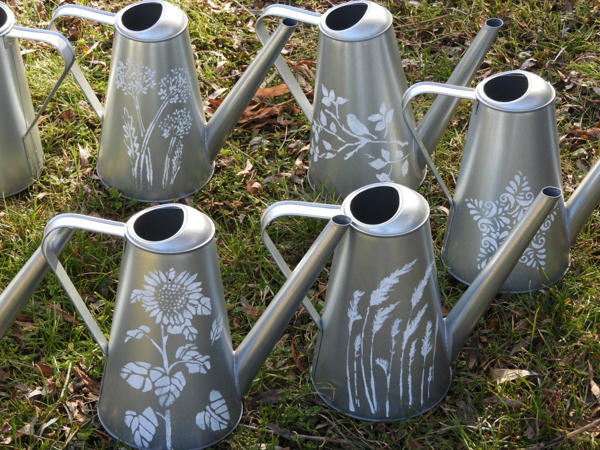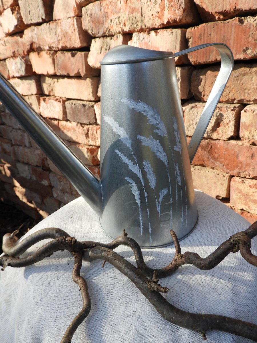 Plechová konvička o objemu 2,5litru a výška 24cm zdobená motivy v barvě bílé a stříbrné barvě plechu