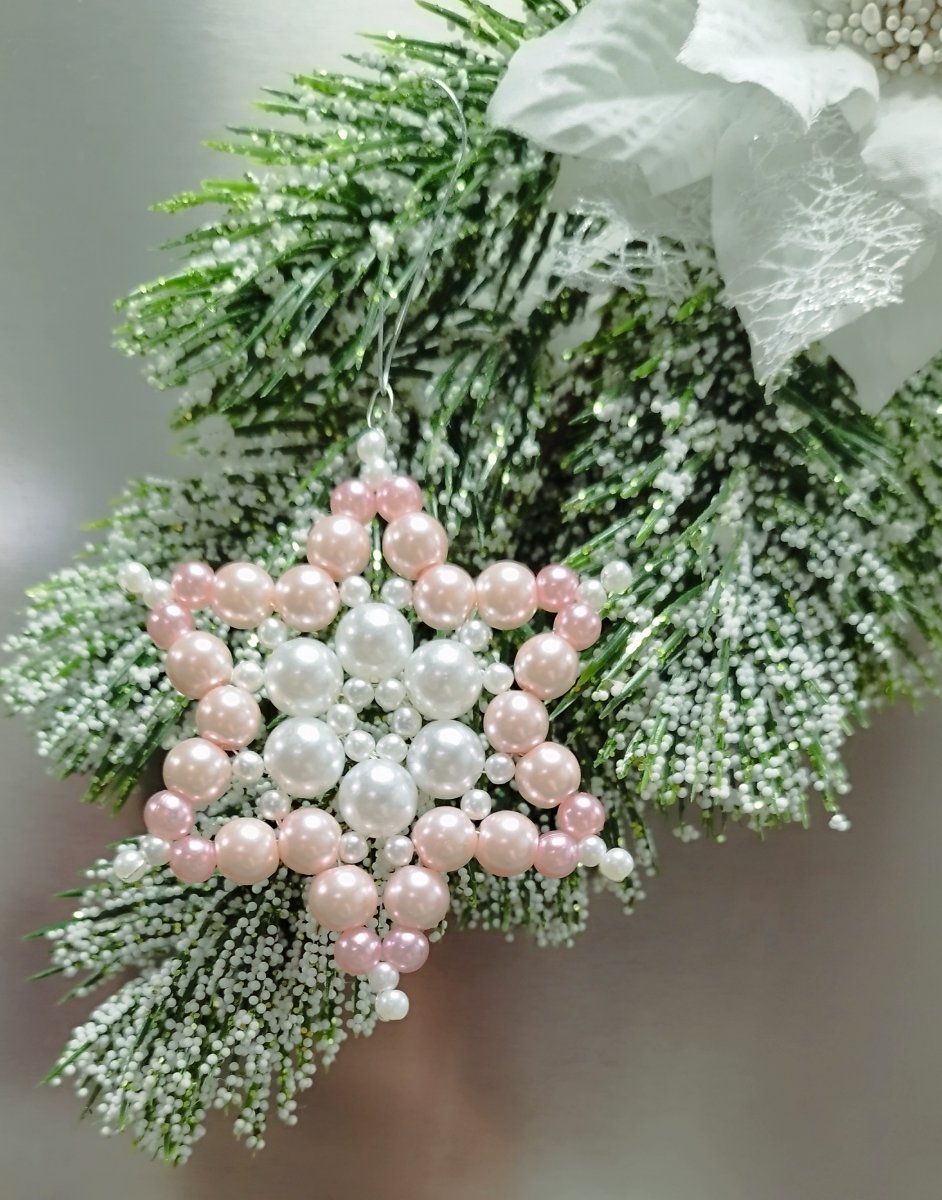 Ručně vyrobená korálková hvězdička bílorůžové barvy. Korálky navlečeny na kovovém drátku.