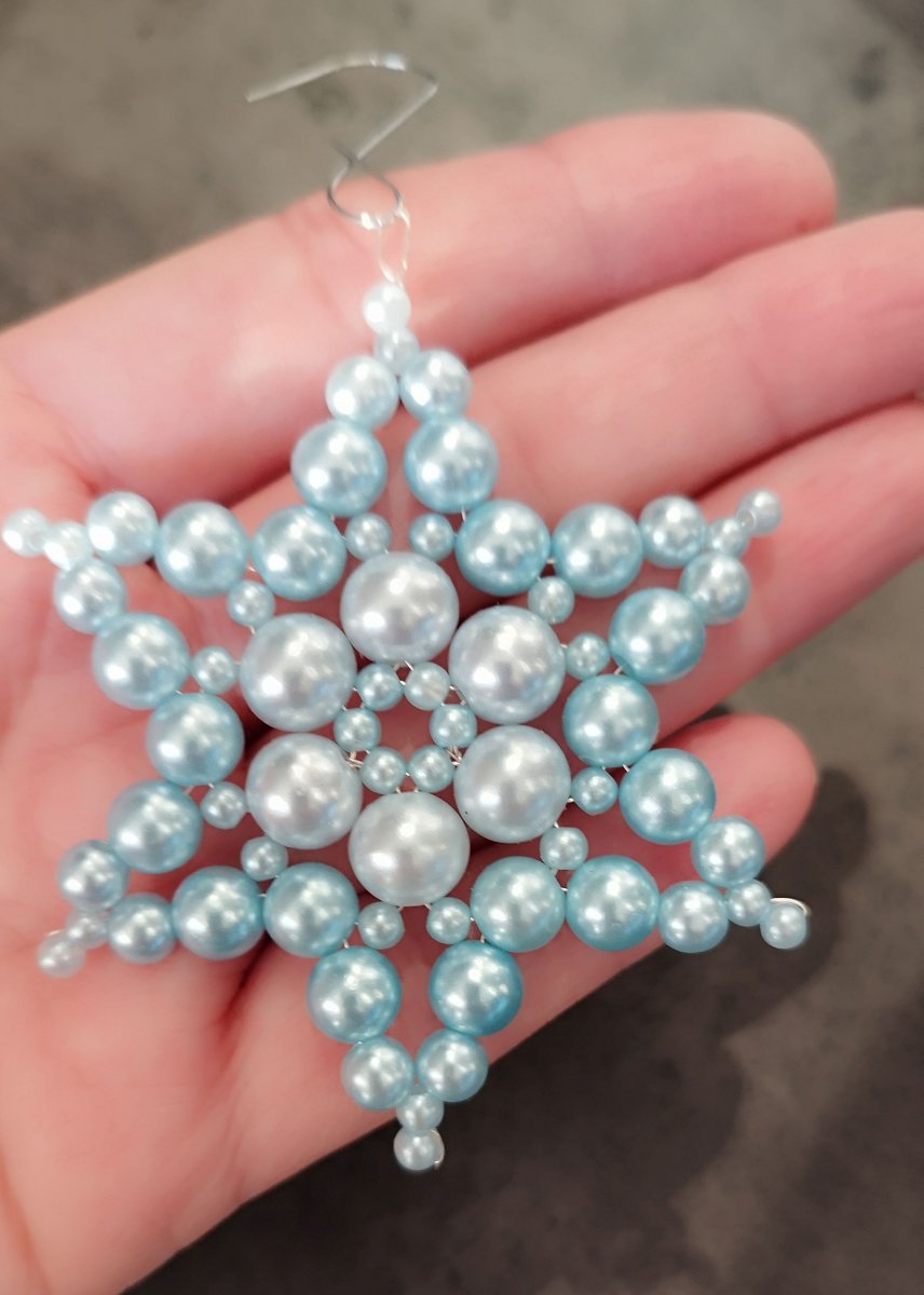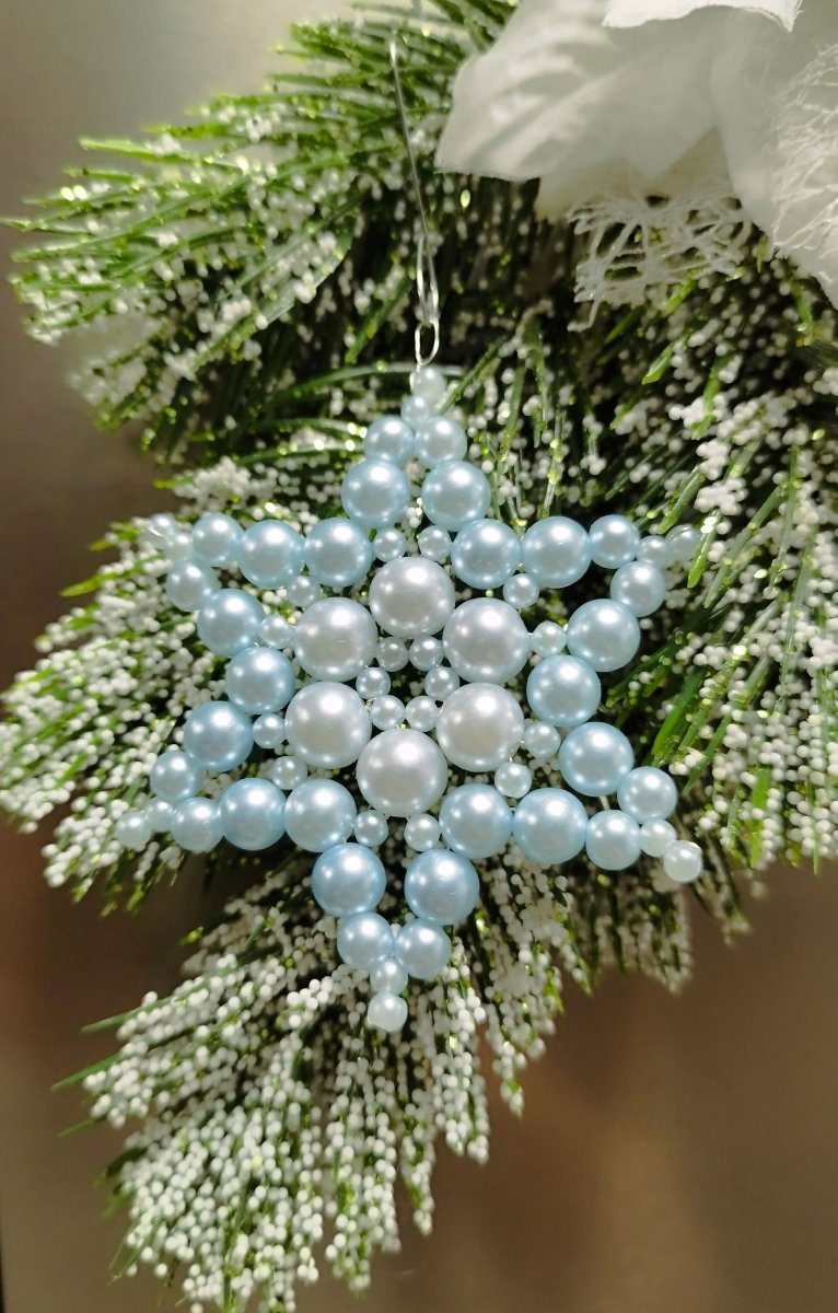Ručně vyrobená korálková hvězdička bíle a světle modré barvy. Korálky navlečeny na kovovém drátku.