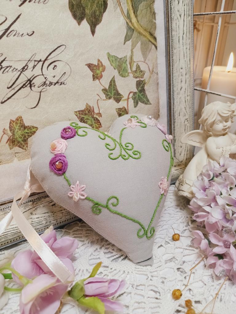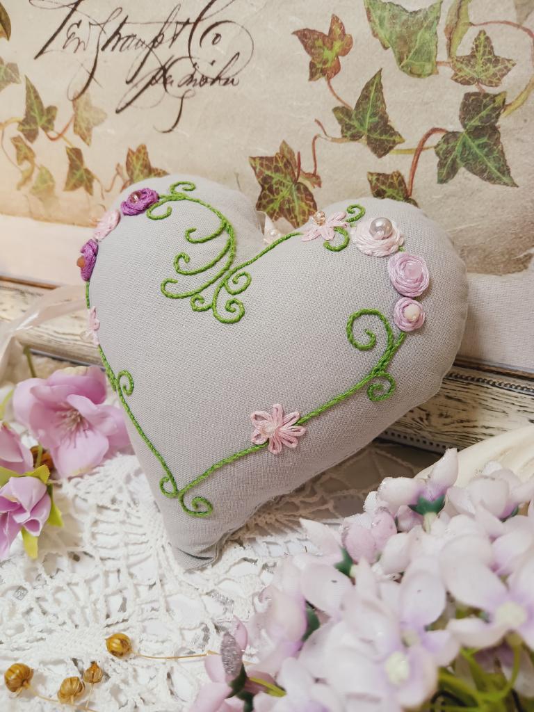 Vyšívané srdce s motivem květin, doplněné lesklými korálky. Srdíčko je v šedé barvě a je plněné dutým vláknem a levandulí. Vhodné jako dárek či pozornost. Může být jenom volně postavené nebo zavěšené, jako dekorace do věnce, nebo na noční stolek pro lepší spánek a zklidnění.