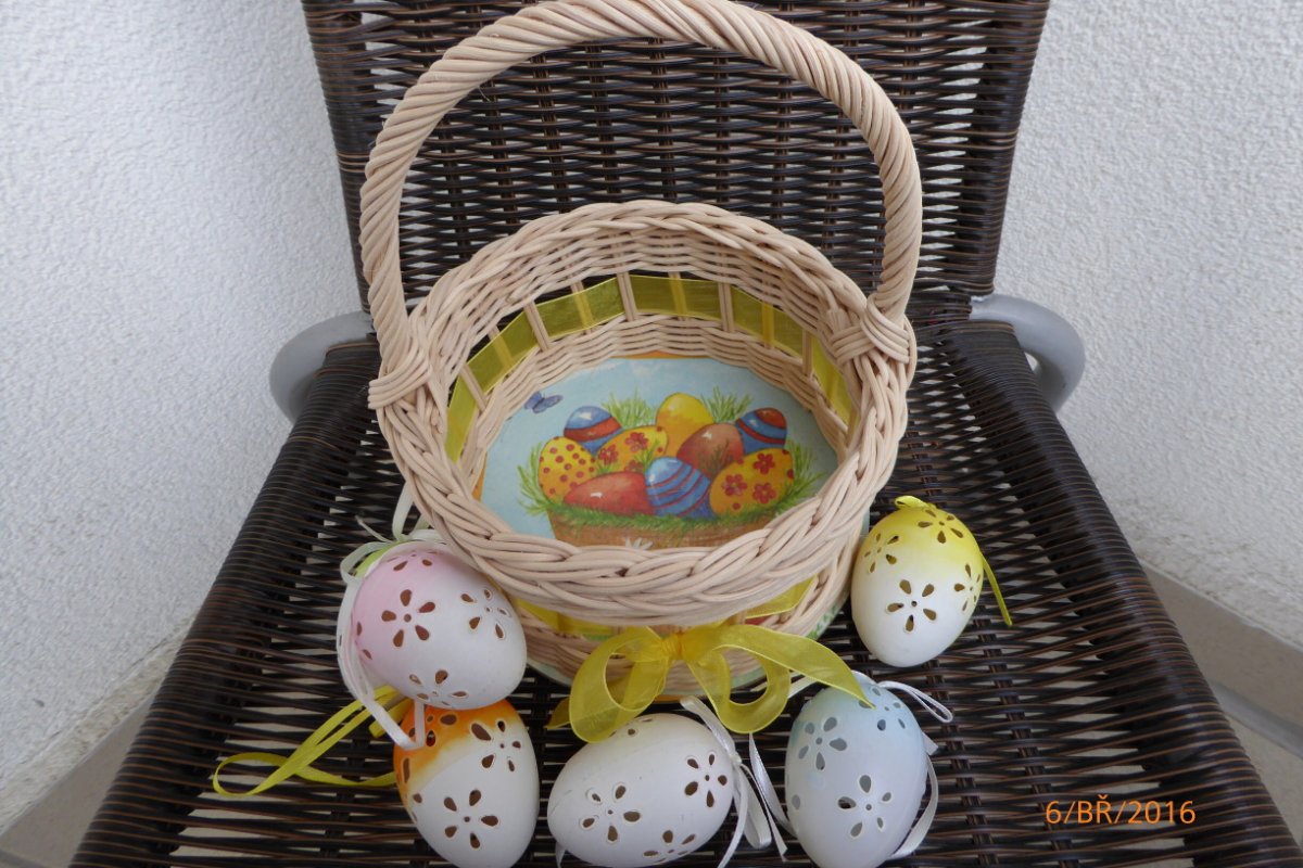 Průměr košíčku 17 cm,výška asi 22 cm.Košíček pletený z přírodního pedigu,dýnko upraveno decoupage technikou.
