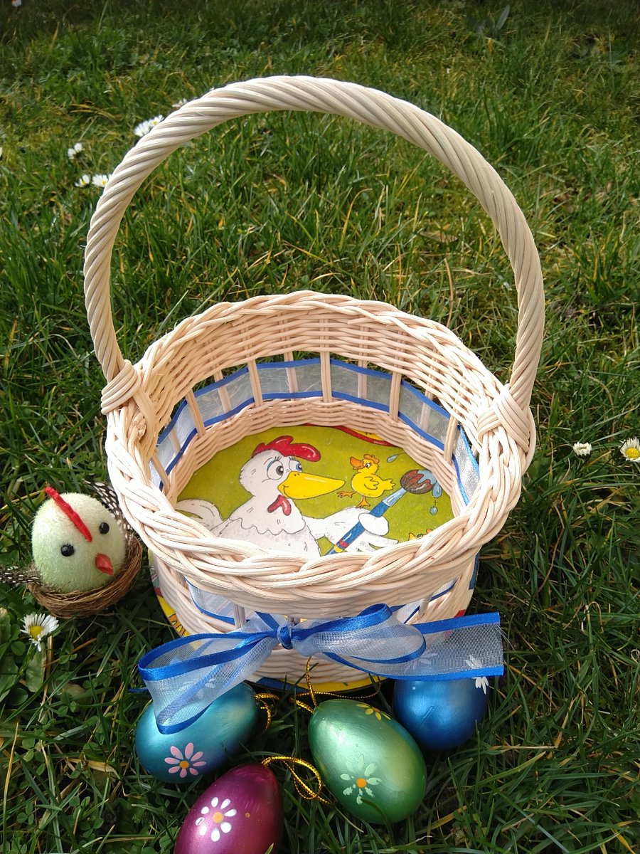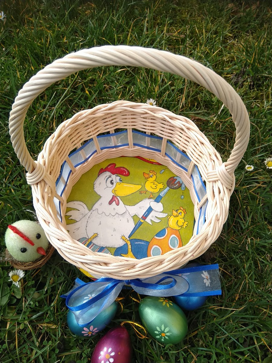 Košíček pletený z přírodního pedigu,dýnko upraveno decoupage technikou.