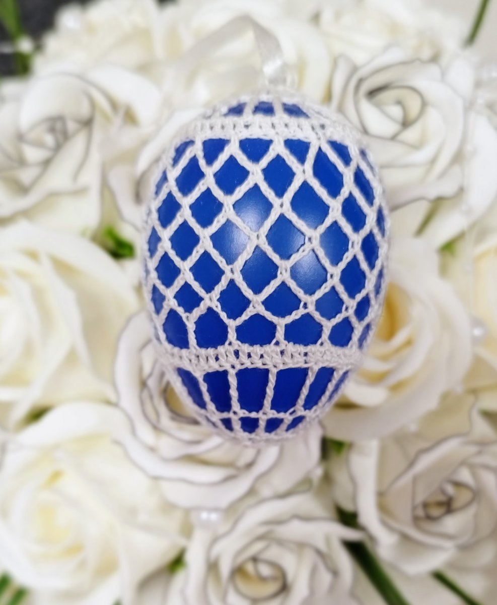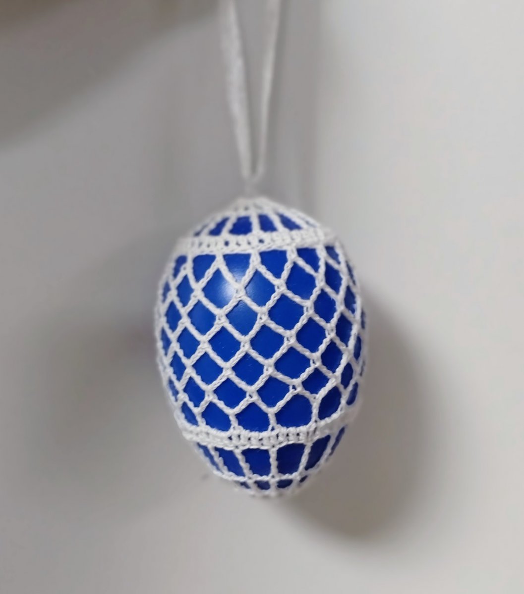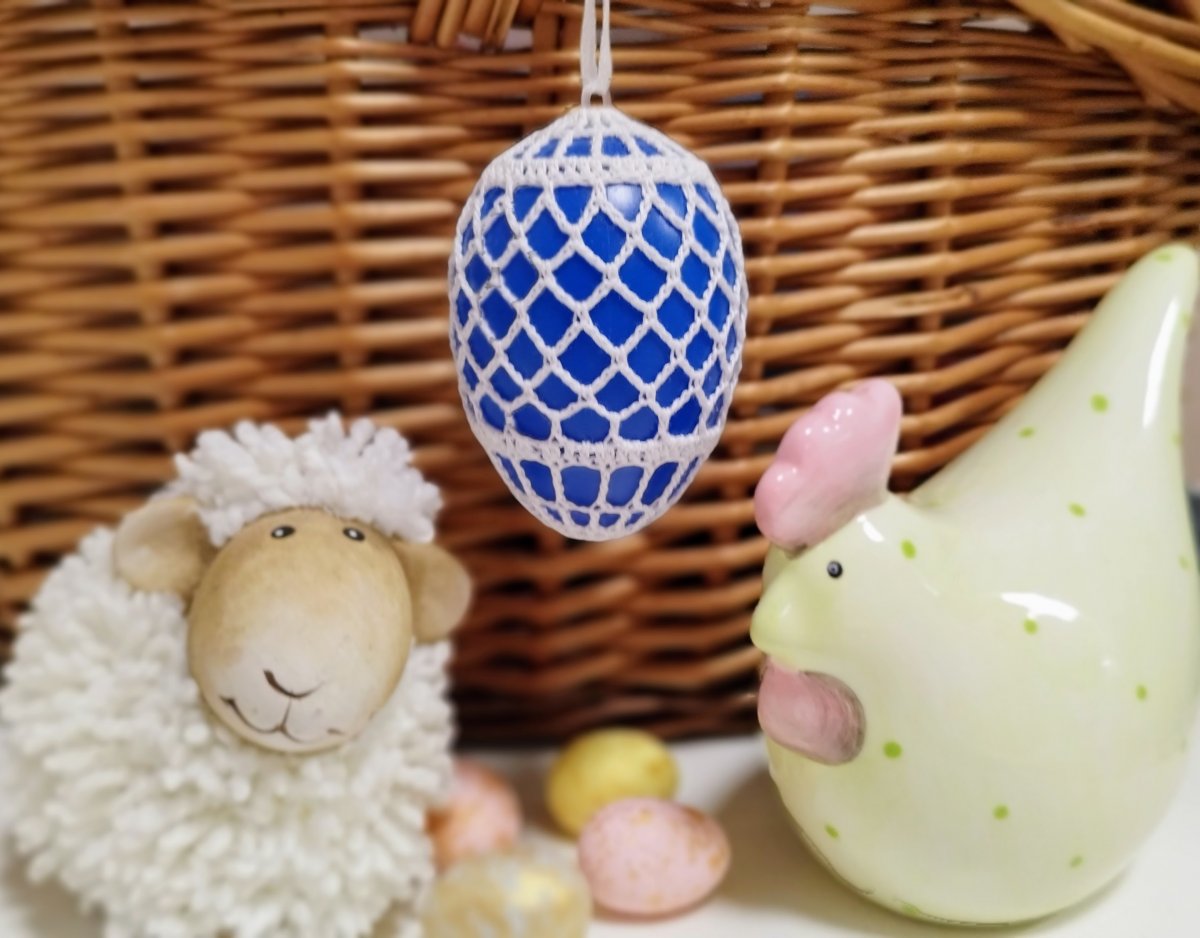 Modré plastové vajíčko, obháčkované bílou přízí.