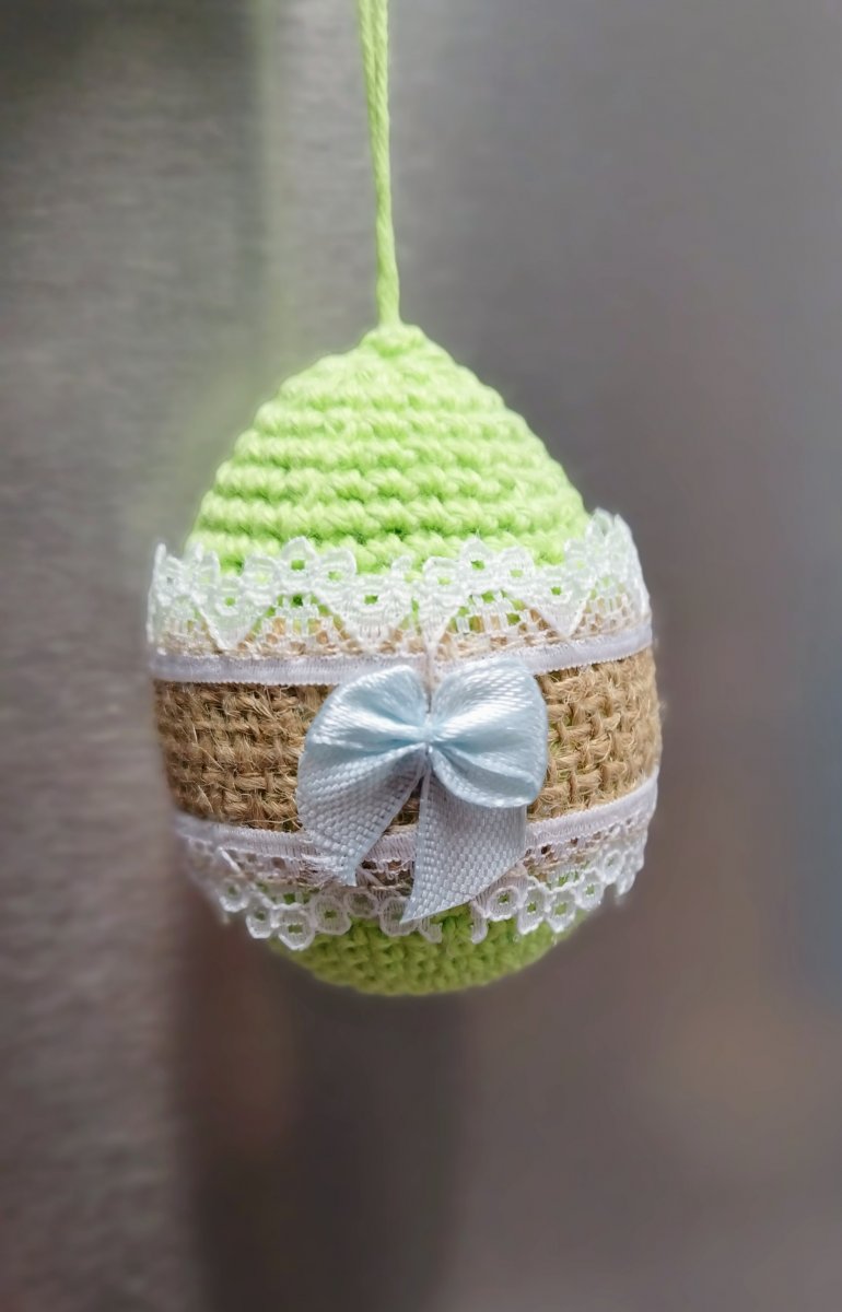 Plastové vajíčko, obháčkované zelenou přízí a ozdobené.