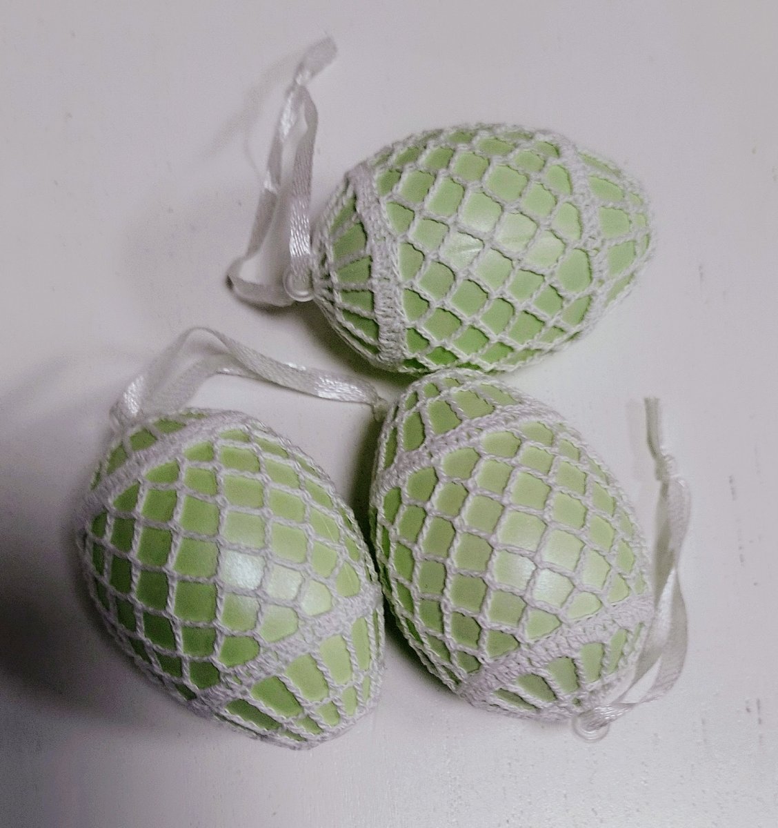 Světlounce pastelově zelené plastové vajíčko, obháčkované bílou přízí.