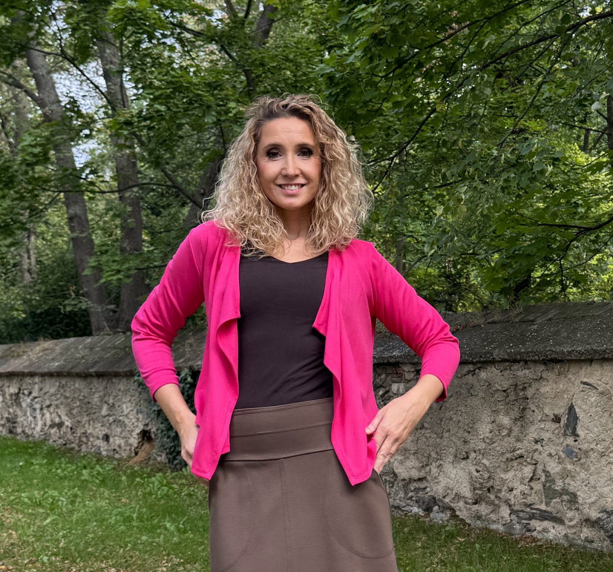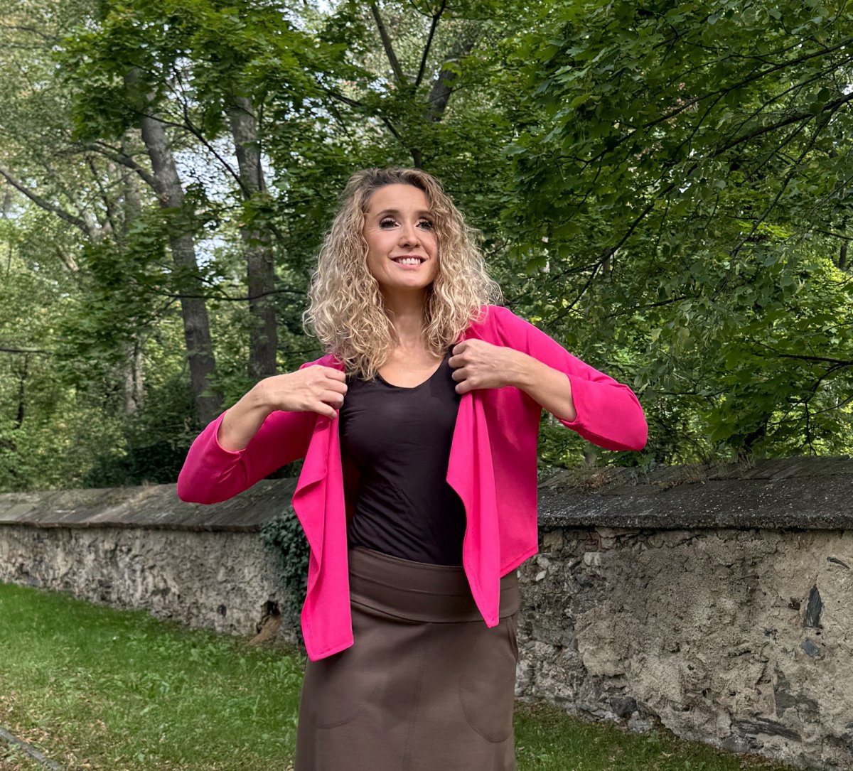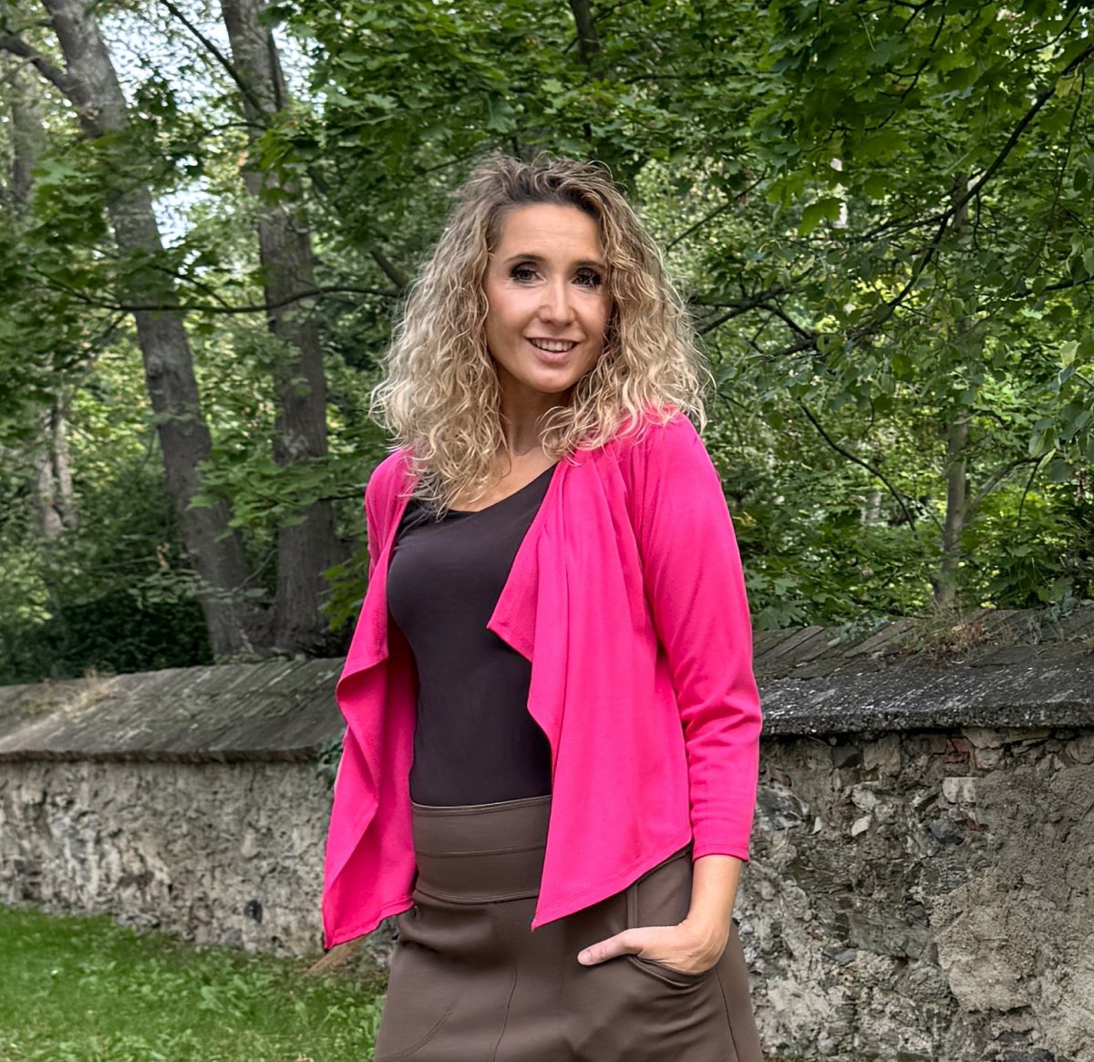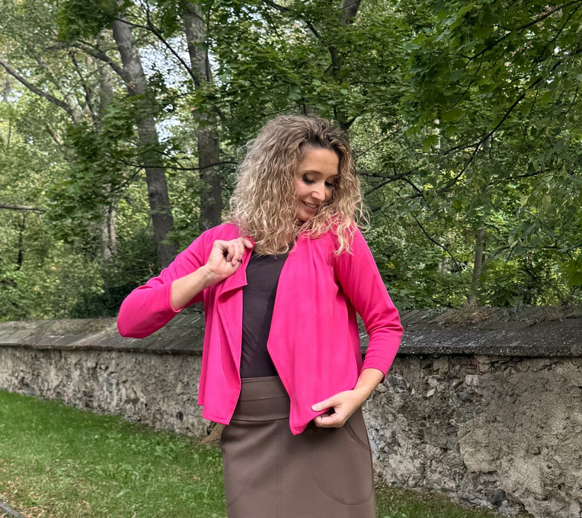 Kardigánek je ušitý ze směsového úpletu vis/pes/el.