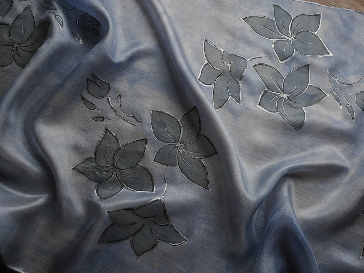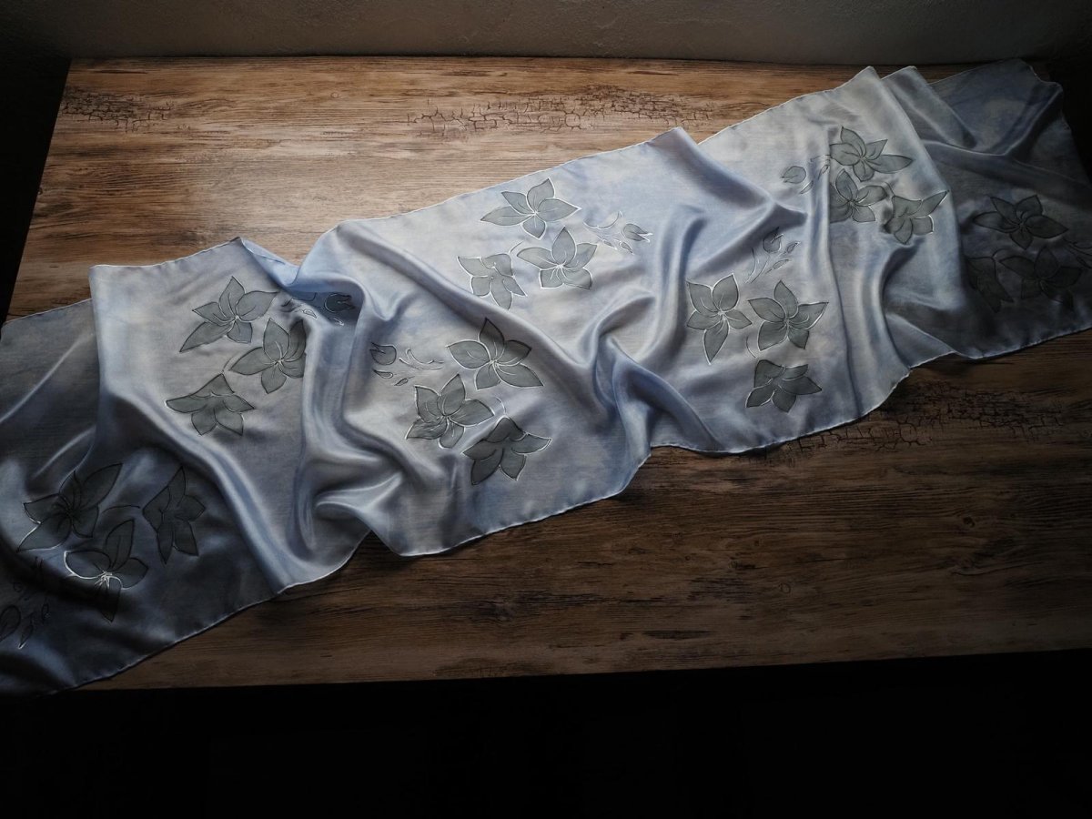 Ručně malovaný šál z přírodního hedvábí (pongé 5). Použití kvalitních barev a tepelné fixace zaručuje dlouhodobou odolnost při opakovaném praní. Snadno se žehlí.