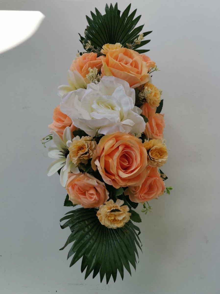 Květiny jsou v betonovém květináči. Květináč je těžký a vítr nemá šanci dekoraci převrátit nebo odfouknout. Dekoraci můžete mít doma, venku nebo dát na hrob.