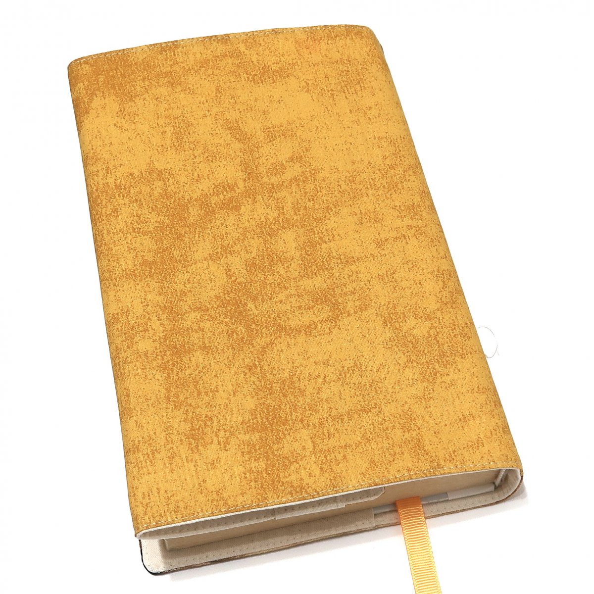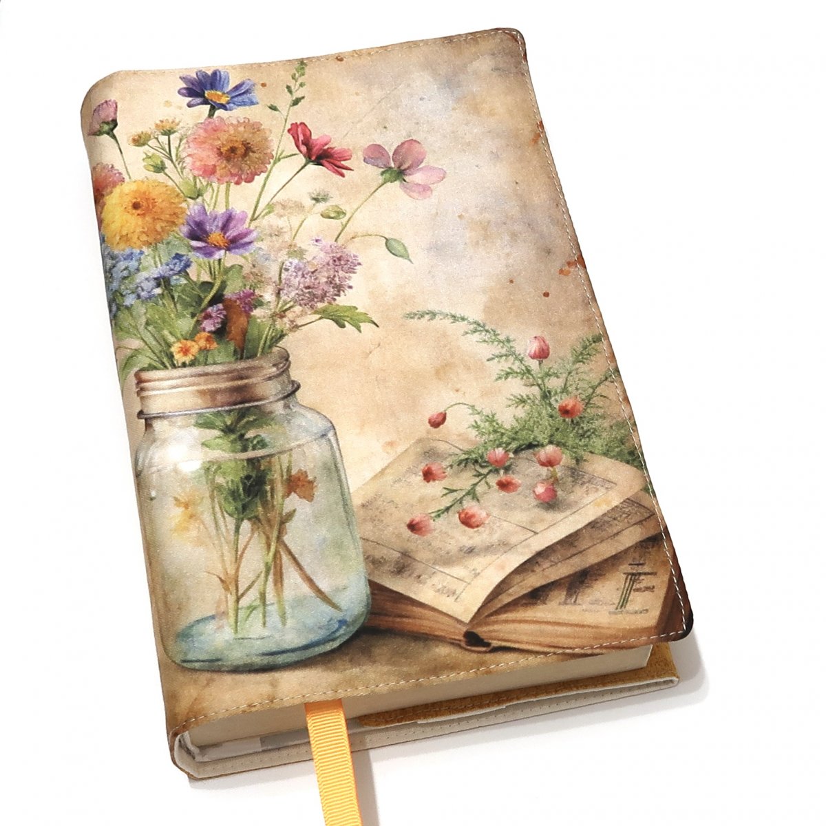 Obal je ušitý z bavlněných látek v kombinaci s originálním panelem v atlasové vazbě. Je vyztužený a opatřený záložkou a s širokou přední klopou. Výztuha je zažehlená lisem.