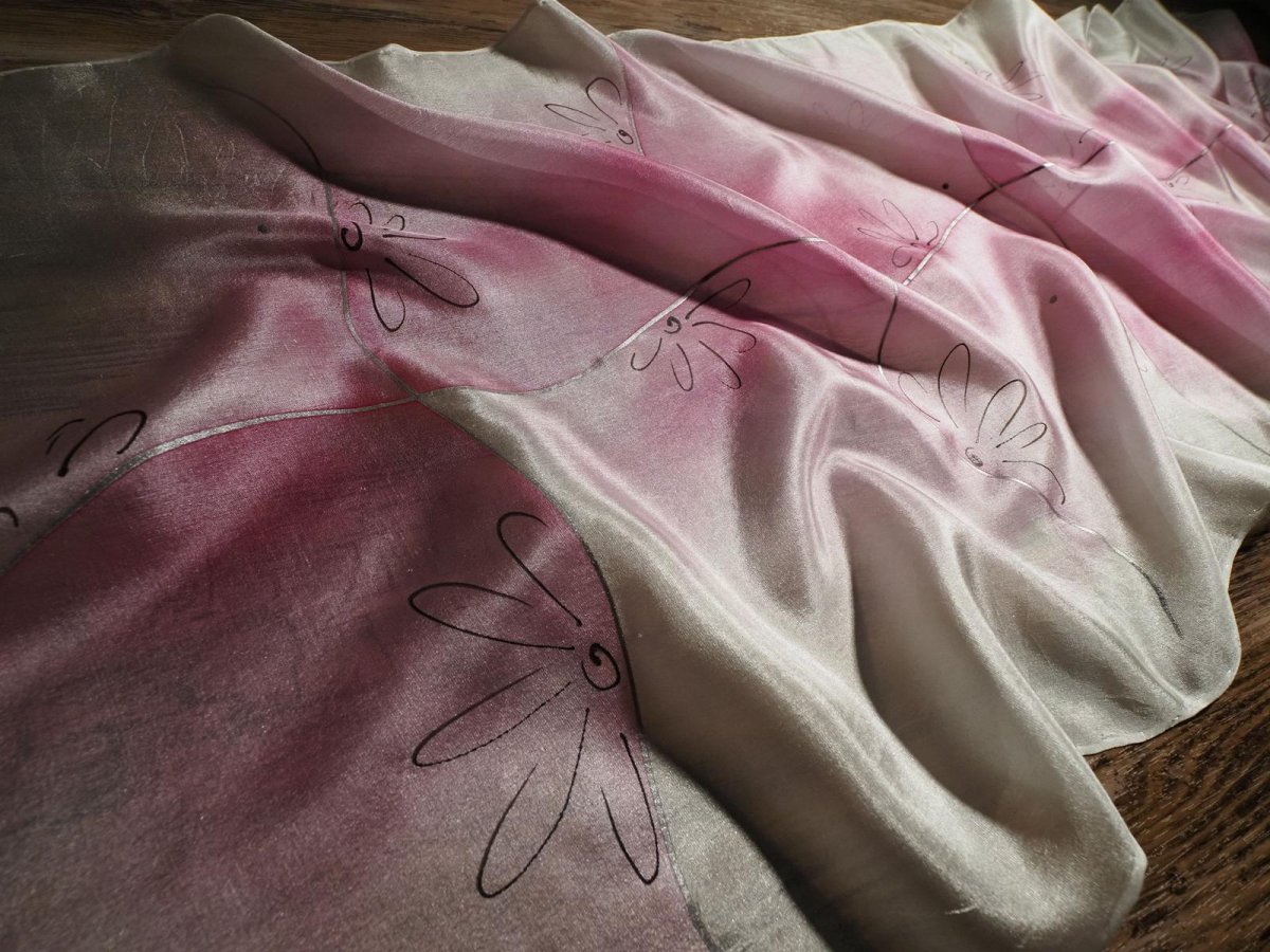 Ručně malovaný šál z přírodního hedvábí (pongé 5). Použití kvalitních barev a tepelné fixace zaručuje dlouhodobou odolnost při opakovaném praní. Snadno se žehlí.