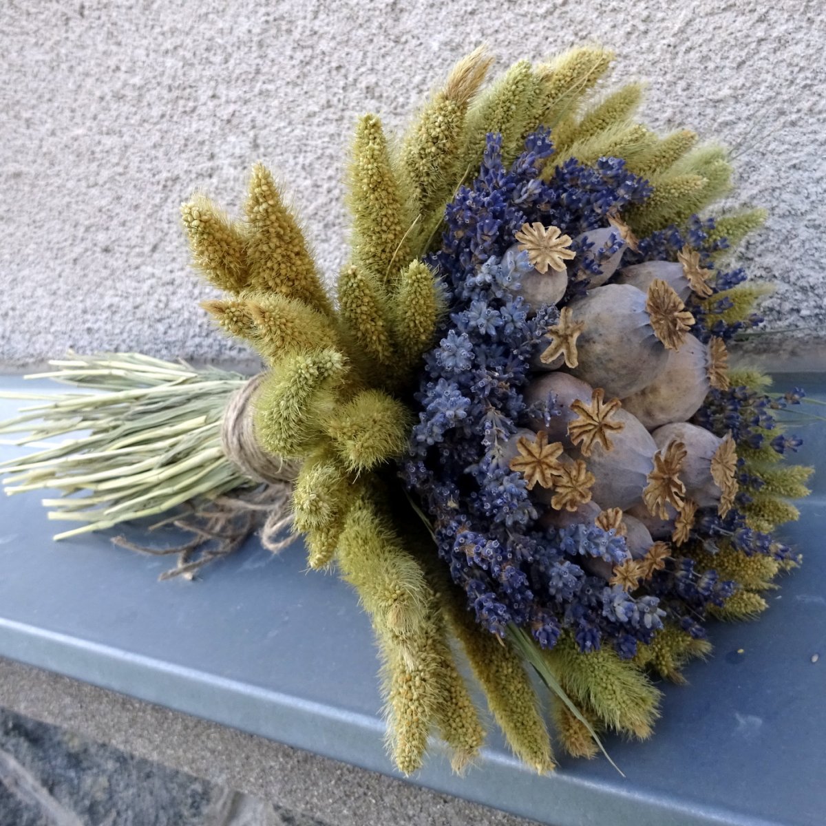 Kytice z levandule, makovic, setárie. Horní průměr 22cm, délka 35cm.