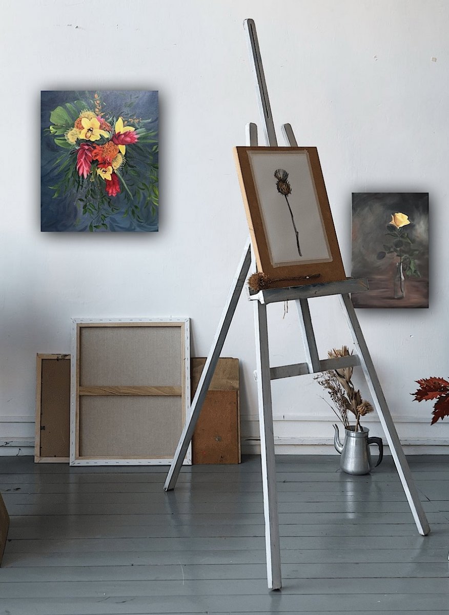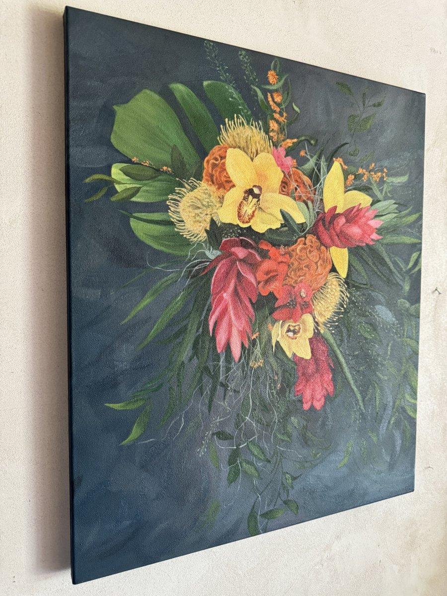 olejomalba na plátně zachycuje bohatou tropickou kytici složenou z exotických květin. Kompozice je dynamická a plná kontrastů - syté barvy květin vystupují z hlubokého, modrého pozadí a jsou obklopeny zelení a jemnými větvičkami.