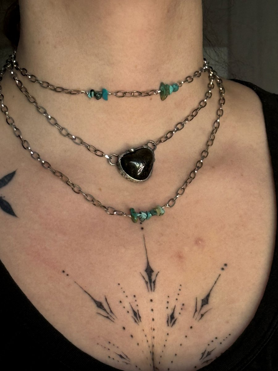 Trojitý náhrdelník z LABRADORITU v kombinaci s drobným tyrkysem, na řetízku z chirurgické oceli. 3 řetízky jsou spojeny do jednoho na zadní straně.