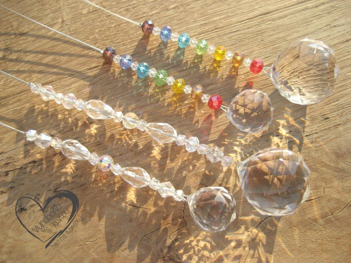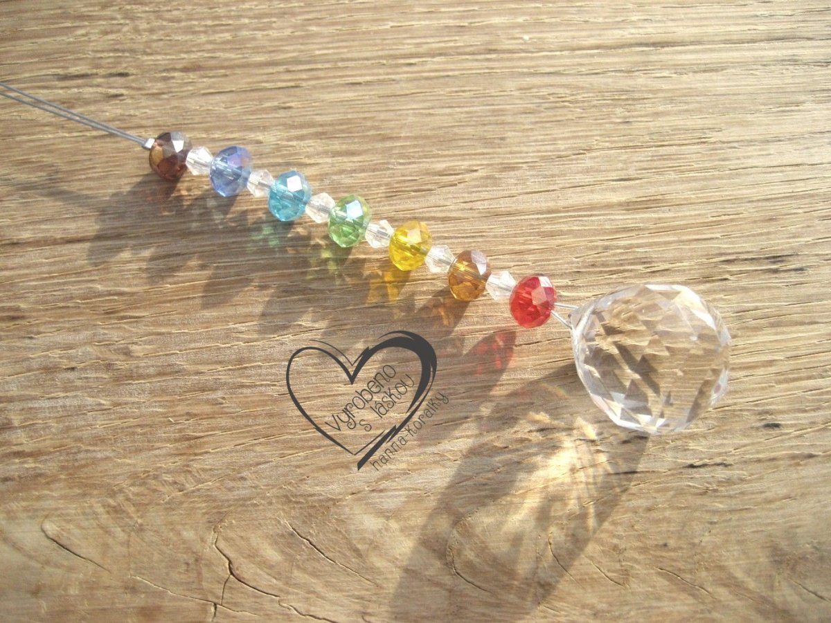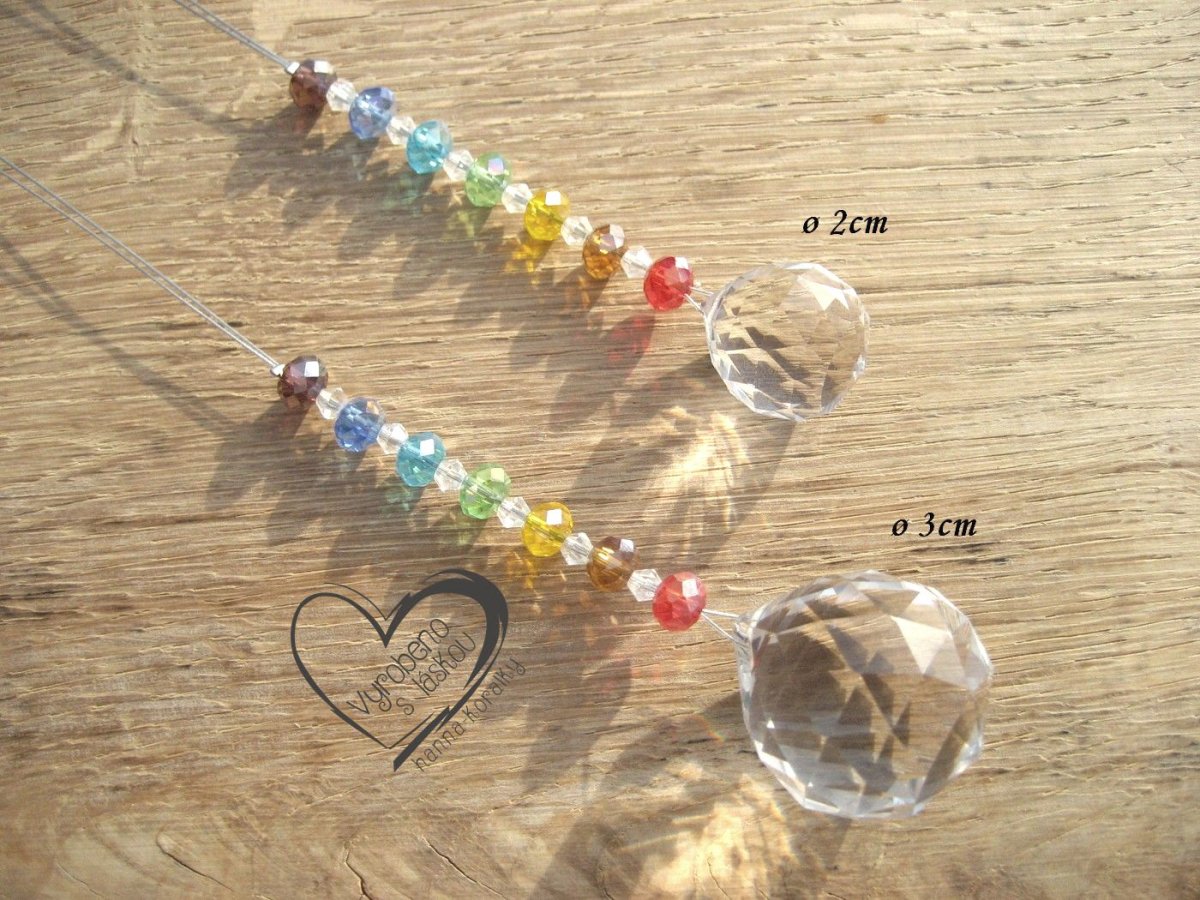 Duhový Feng Shui závěs je vyrobený z broušené koule 2cm a broušených korálků v čakrovém – barevném provedení, vše je zavěšeno na dvojitém, ocelovém lanku s očkem - v délce – 35cm, 55 cm nebo 75cm dle vašeho výběru - do poznámky k objednávce napište požadovanou délku.