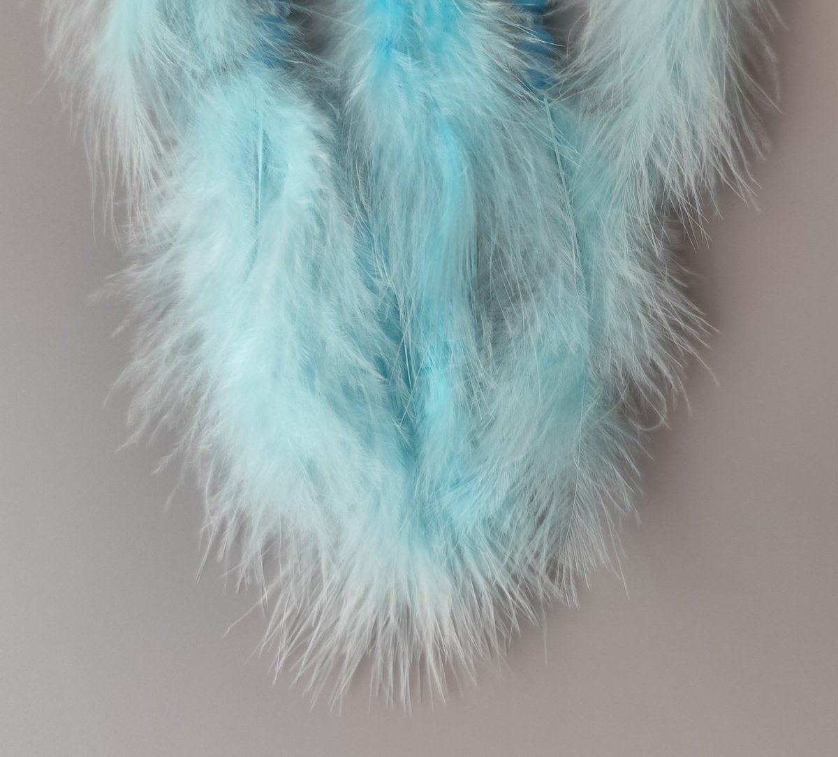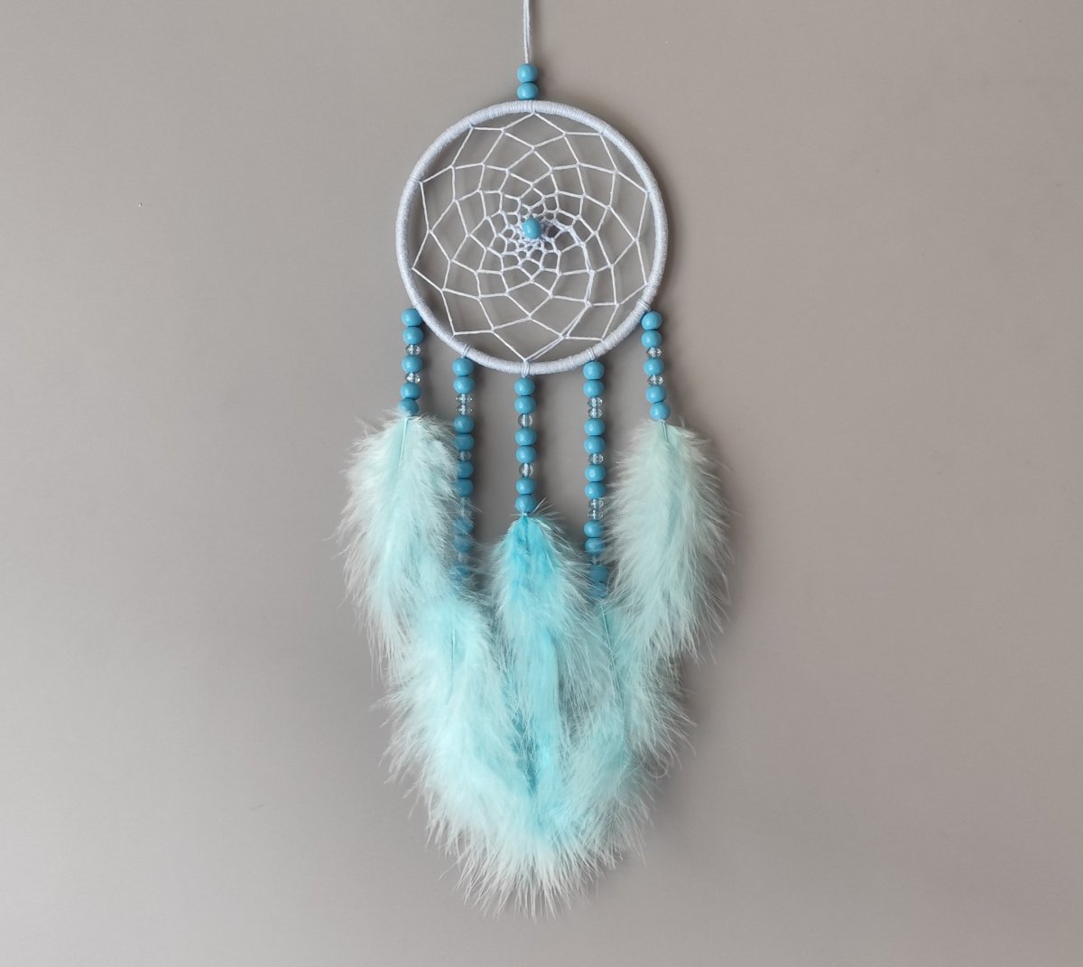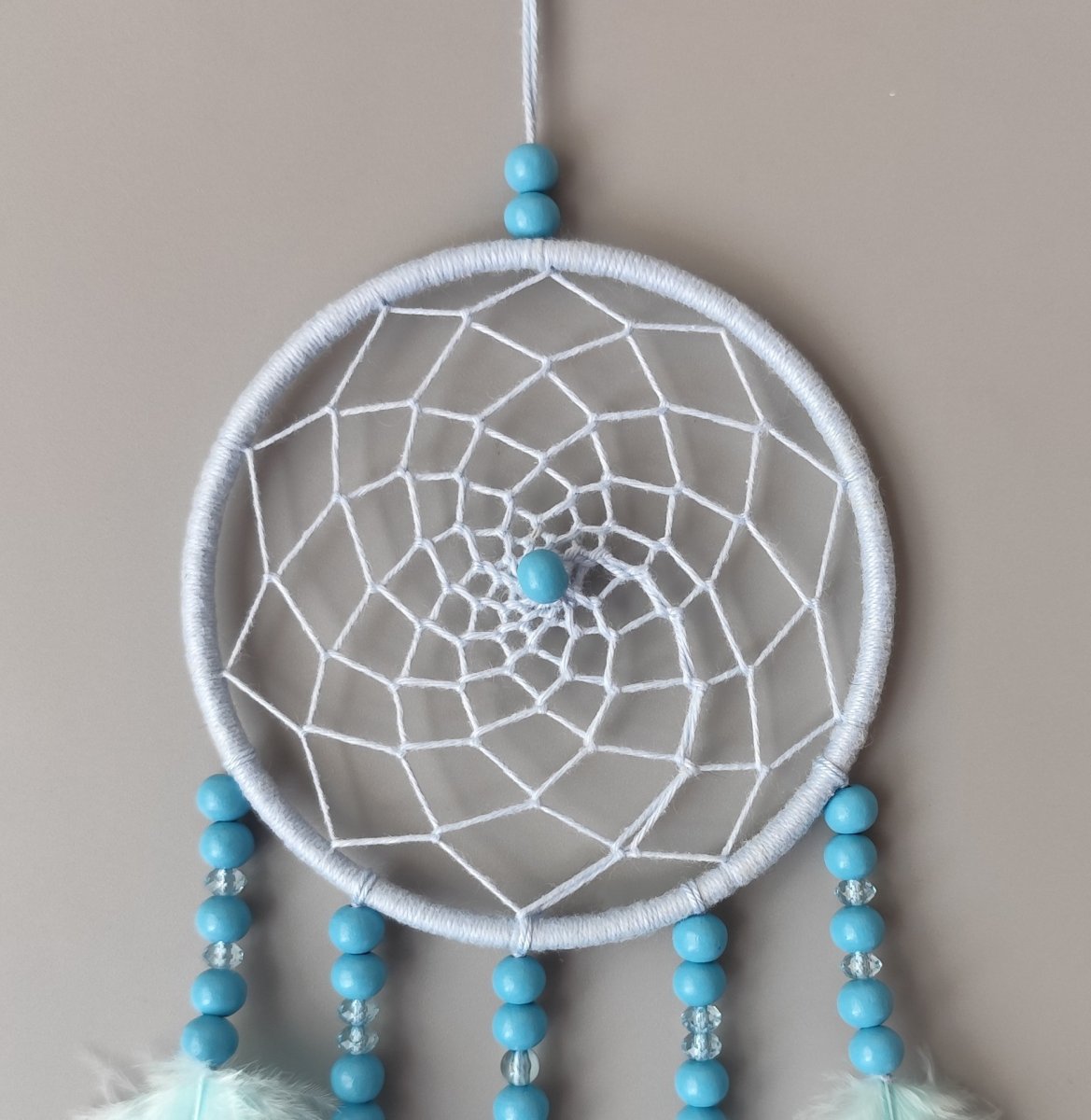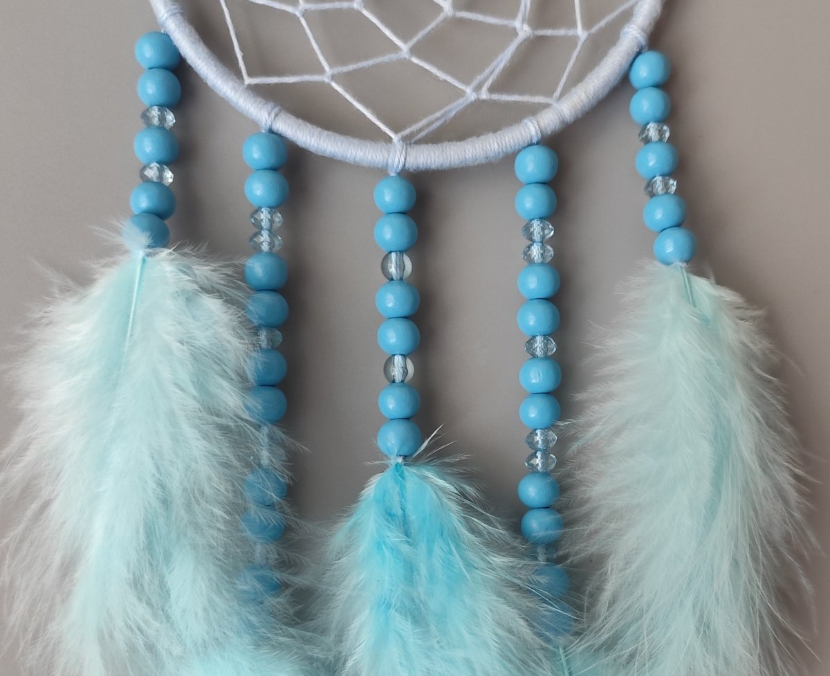 Základní kruh má průměr 10 cm a je omotán a vypleten 100% bavlnou. Na kruhu jsou na dřevěných a plastových korálcích zavěšena pomněnkově modrá pštrosí peříčka.
